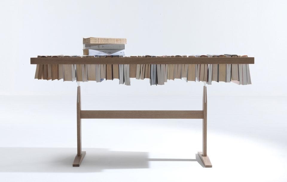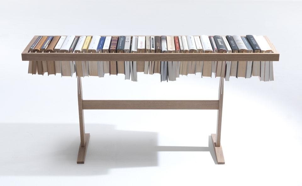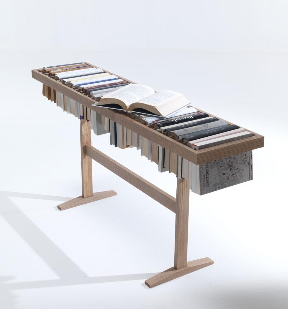 Raw Edges interpreta in chiave unica e insolita il concetto di libreria che è parte integrante del DNA Lema: fin dallo sviluppo del primo sistema a spalla portante, poi evolutosi in Selecta, l'azienda ha seguito con attenzione l'evoluzione delle esigenze dei mercati e dei consumatori per tutto ciò che riguarda il contenimento e soprattutto l'evoluzione della libreria in un mondo contemporaneo che sempre più si orienta verso paperback e e-book. Yael e Shay hanno lavorato proprio sul concetto di libro come oggetto che diventa materiale, che trasforma la sua funzione e si reinventa; da questo pensiero nasce Booken che è contemporaneamente tavolino, mensola e libreria.