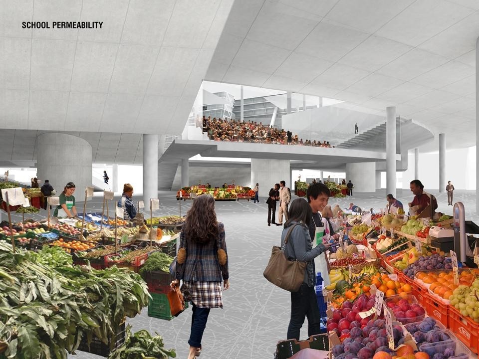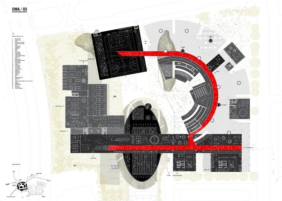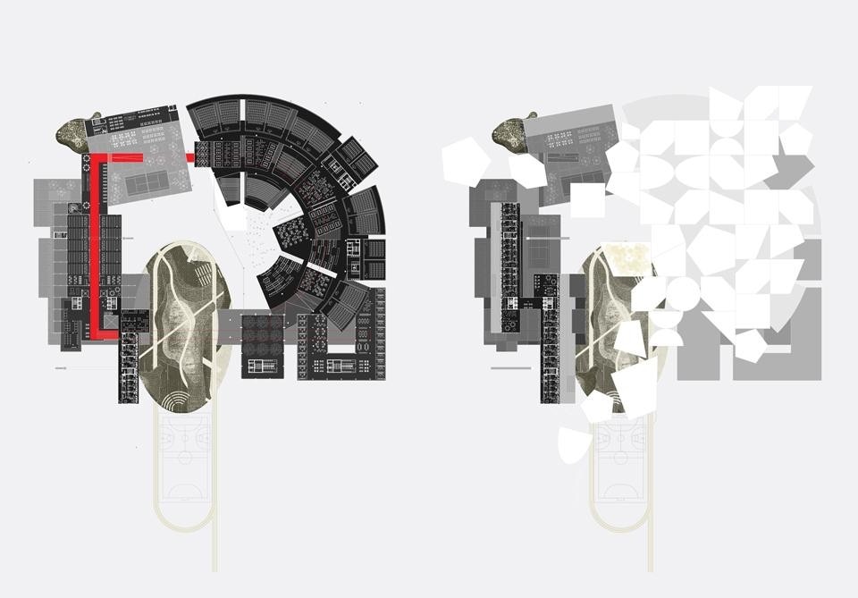 Le intime stanze per la lettura e le aree generali di lavoro sono disposte in un unico "anfiteatro", dal quale la vita della scuola può estendersi in tutte le direzioni. I blocchi delle residenze "proteggono" le attività più intime della palestra mentre una copertura di ombrelli architettonici definisce lo spazio sociale tra di loro. Il percorso principale si collega al vecchio campus, diventa caffetteria, aula studenti e spazio di lavoro, raccorda le piscine, marca l'ingresso alla palestra, e collega l'"anfiteatro" attraverso il centro sportivo. L'intero complesso è permeabile alle attività della città, ogni singola estensione urbana è concepita proprio per stabilire un collegamento adatto e stimolante.