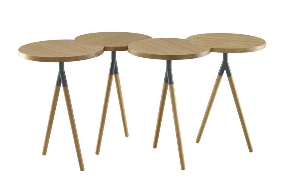 Itisy è una console che può facilmente essere trasformata in tavolo da pranzo. Grazie a snodi metallici si anima per raggruppare i quattro piani allineati (diametro 54 cm), formando un tavolo da pranzo quadrato di circa 110 cm di lato che può ospitare fino a quattro commensali. In ogni configurazione, l'insieme risulta armonioso grazie alla doppia base in rovere massello che sostiene ogni ripiano e evoca i trampoli tradizionali.