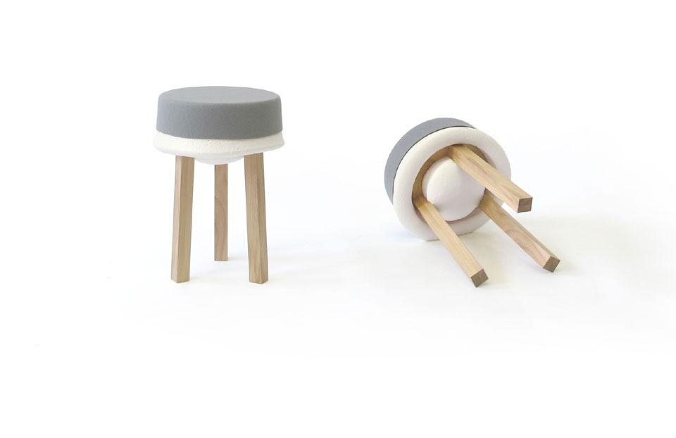 Con lo sgabello rigirato, il tessuto (feltro sagomato) viene usato come se fosse un recipiente nel quale versare la schiuma liquida, mentre il telaio rimane fissato su una struttura di sostegno. Una volta versata la schiuma, questa si espande lentamente, uscendo dal feltro e incorporando il telaio stesso, unendo in questo modo i due componenti.