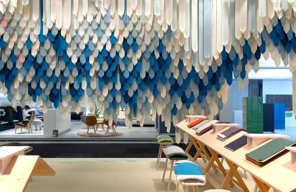L'imponente installazione tessile genera un ambiente tridimensionale formato dalle "insolite tegole verticali" sospese. "Questi elementi spaziali", concludono i designer, "sono stati ispirati dall'idea di un salice piangente, sotto il quale ricreare uno spazio intimo, pur nel contesto di una grande mostra".
