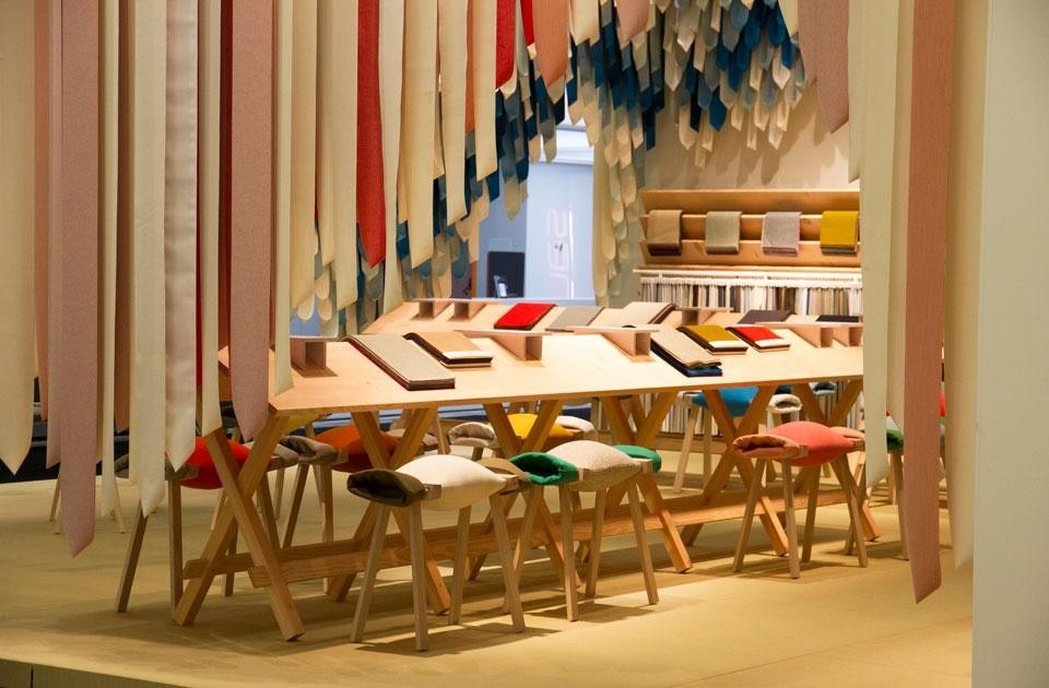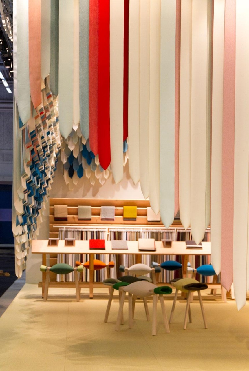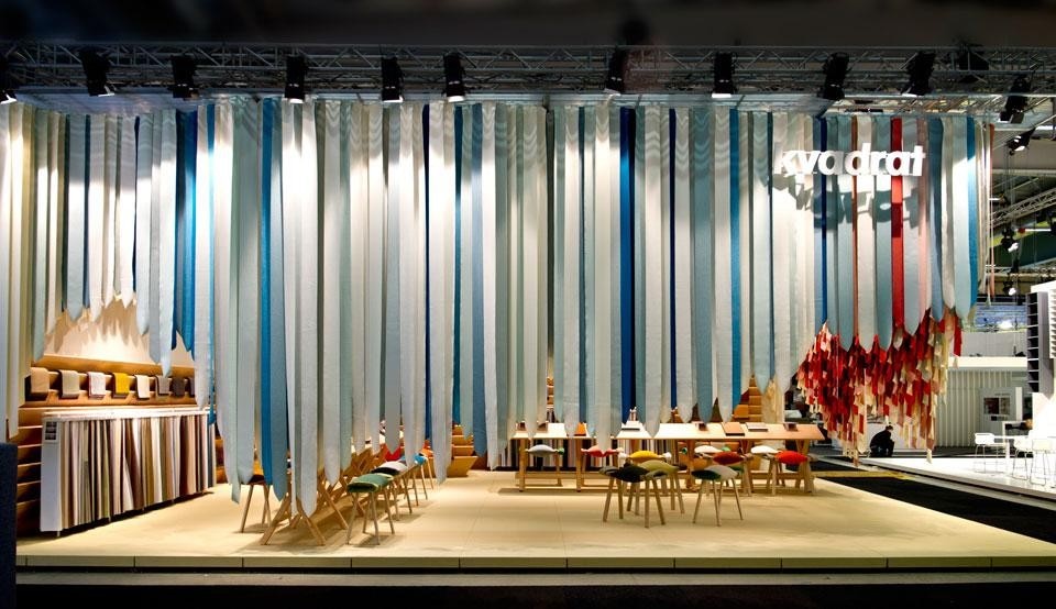 I progettisti hanno voluto ricreare l'atmosfera di un pic-nic ambientato in una foresta incantata. "Volevamo ricreare all'interno di una fiera commerciale una situazione surreale, calda e accogliente", affermano i designer Yael Mer e Shay Alkalay. Lo stand si basa su due elementi principali: la struttura di legno e le strisce di tessuto che pendono dal soffitto. La struttura funge così da display per i campioni Kvadrat e rievoca l'immagine di una cabina di legno. Realizzati in legno di abete Douglas, prodotto dall'azienda danese Dinesen, i pannelli orizzontali sono stati orientati in modo tale da mostrare ai visitatori le strisce di tessuto da varie angolazioni.