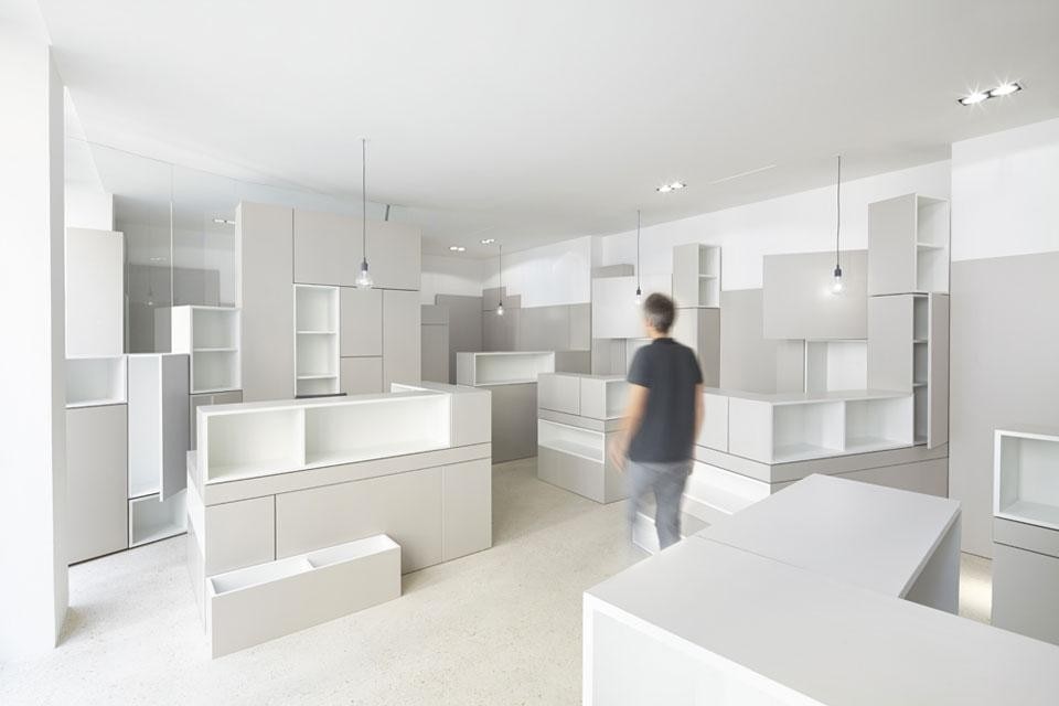 Creando una serie di volumi di forma e dimensioni diverse, gli architetti hanno dato vita a un ambiente completamente bianco in cui i mobili, le scrivanie e le pareti espositive sono tenuti insieme da una serie di elementi modulari. Per risparmiare tempo i vari blocchi sono stati prima costruiti e poi trasportati e posizionati sul posto. Le cinque postazioni hanno il vantaggio di affacciarsi sia sull'area comune, che verso settori privati.
