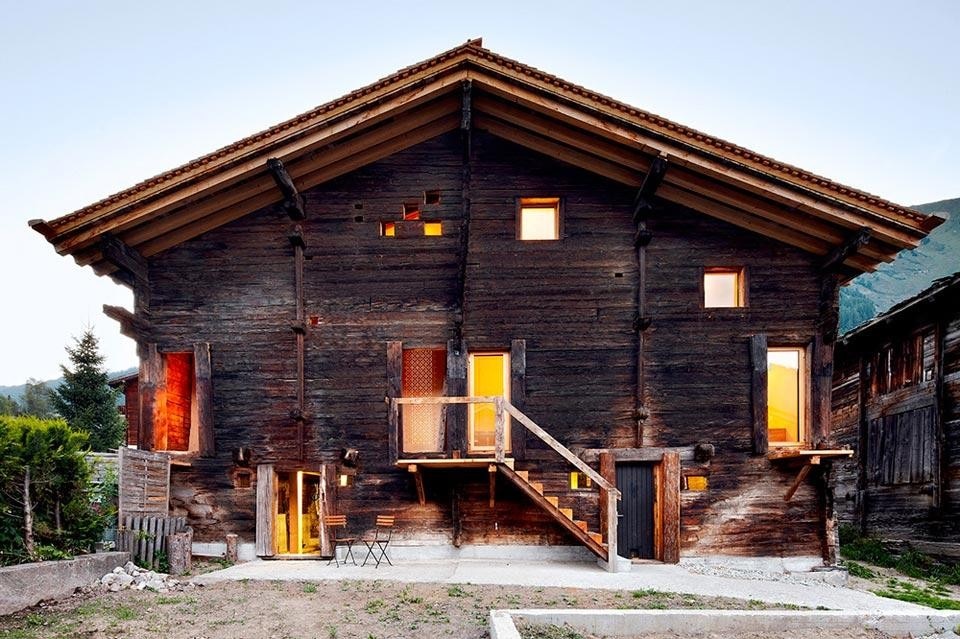 Una di queste alcove è impiegata come ingresso, mentre l'altra, di fronte al soggiorno, come loggia. Le "facciate" interne sono generosamente dotate di superfici vetrate mentre il collegamento verticale esterno, in passato utilizzato per trasportare il fieno dal granaio superiore alla stalla di sotto, funziona oggi come scala d'accesso alla casa.