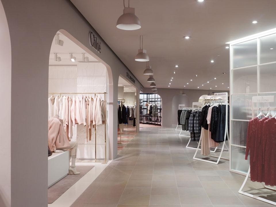 "Gli scaffali e gli appendiabiti", continuano, "contribuiscono a generare quest'atmosfera tranquilla. L'illuminazione ricorda quella delle strade della città, con i lampioni appesi ai cavi tra un edificio e l'altro, mentre gli ingressi alle mini-boutique del piano sono incorniciate da archi simili a quelli del centro. Il nostro desiderio era quello di condensare l'emozione e i piccoli piaceri provati nell'esplorare Milano a piedi".