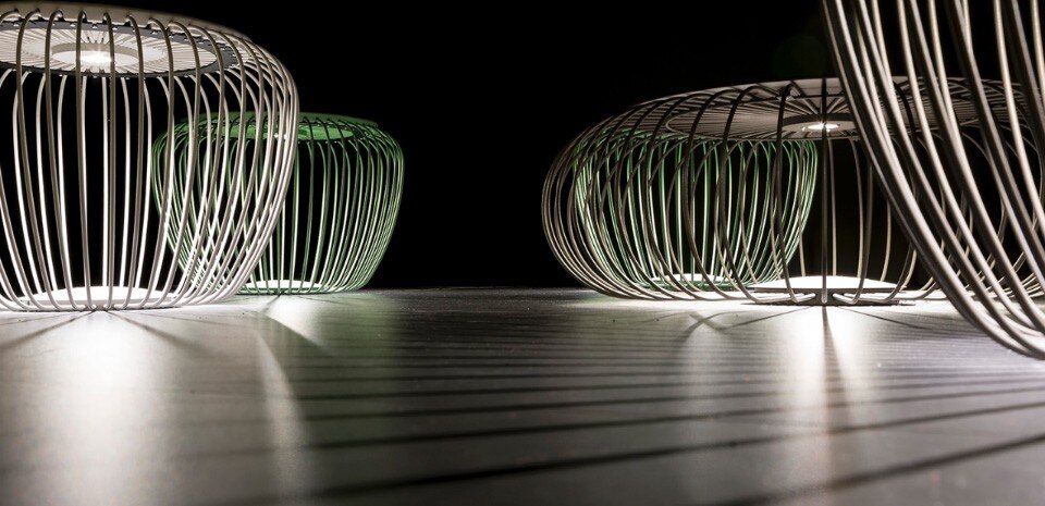 Durante l’evoluzione del progetto abbiamo considerato una varietà di concetti formali riferiti alla struttura, una molteplicità di formati e di composizioni possibili tra le differenti forme, dato che la struttura permette mascherare parzialmente la lampada. Tutti questi aspetti invitano a trasgredire l’ortodossia funzionale e a interpretare nuove possibilità, facendo emergere numerose tipologie di elementi, tra cui pouf, tavolini, fioriere, etc. Questo processo comporta inevitabilmente una sfida: la reinterpretazione funzionale è in se’ delicata e se da un lato rischia di rimanere una forma di racconto superficiale o di creare confusione, dall’altro offre l’opportunità di creare composizioni luminose che producono a loro volta spazi e zone esterne molto suggestive.