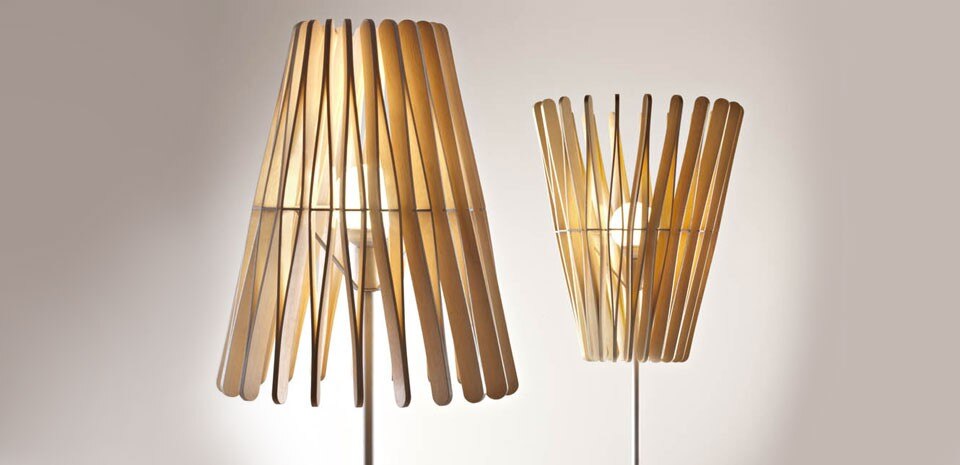 Questa linea di prodotti si sviluppa reinterpretando le diverse tipologie di lampada come piantane, applique, sospensioni, lampade da tavolo, a partire da un unico modulo che si comporta al pari di una materia plasmabile. Grazie alla levigatezza del legno, la sorgente luminosa viene 'addomesticata' diffondendo una luce sfumata.