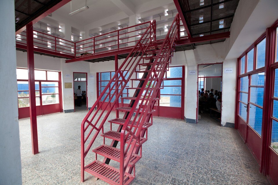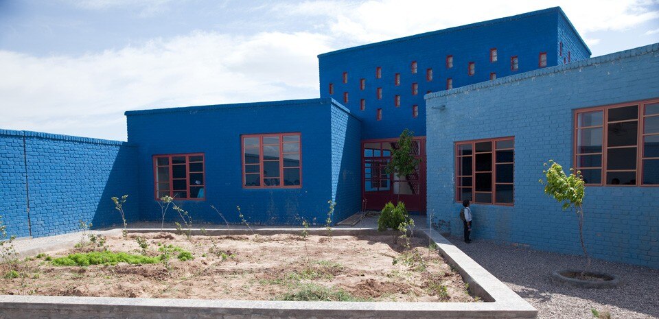 La scuola ospita otto classi, diverse aree di servizio, una biblioteca a doppia altezza e un giardino per le lezioni all’aperto. Costruita in cemento armato con rivestimento in mattoni, è stata tinteggiata esternamente per via del budget limitato. Le varie tonalità di blu che rivestono le pareti richiamano al pigmento dei lapislazzuli usati nell’artigianato locale, mentre i serramenti offrono un po’ di contrasto grazie al loro rosso acceso.