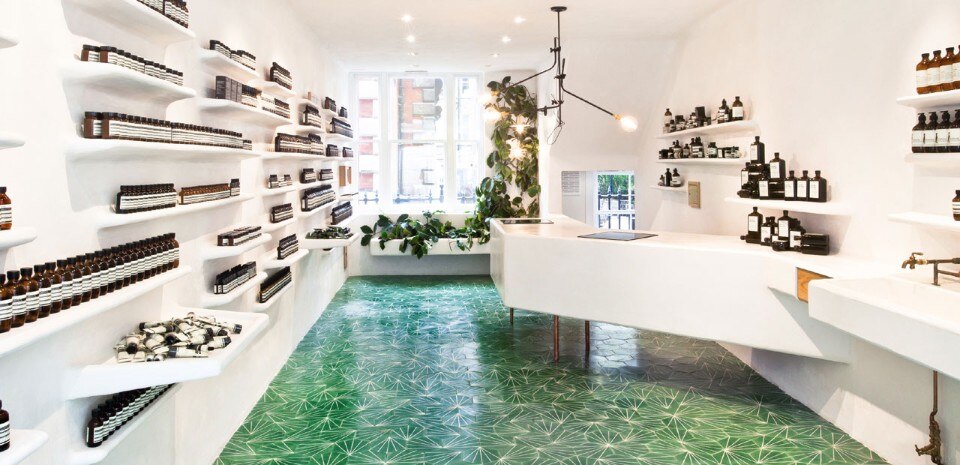 Inaugurato a Londra, il negozio Aesop progettato dallo studio di architettura Ciguë è caratterizzato da pareti candide, tubature in rame a vista e pavimento in piastrelle di cemento verdi.