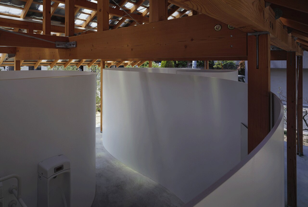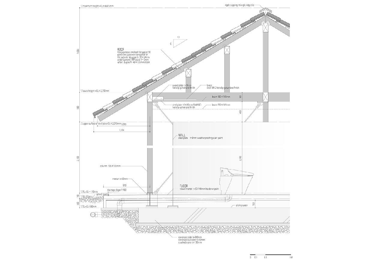Per la copertura, Tato Architects si è ispirato agli edifici vicini, utilizzando tegole in ceramica e piastrelle in vetro a mosaico, compatibili tra loro grazie alla standardizzazione, e sono state aggiunte piastre in FRP per il rivestimento per far sembrare che la luce filtri irregolarmente come tra i rami degli alberi.