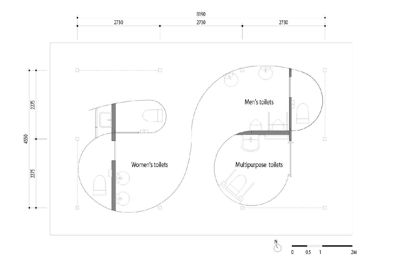Per realizzare una toilette in un ambiente di questo tipo bisognava adattarlo alla struttura esistente, perciò è stato necessario cominciare dalla suddivisione dello spazio mediante l’utilizzo di superfici curve, come un drappo posto sotto il tetto della cabina tradizionale.