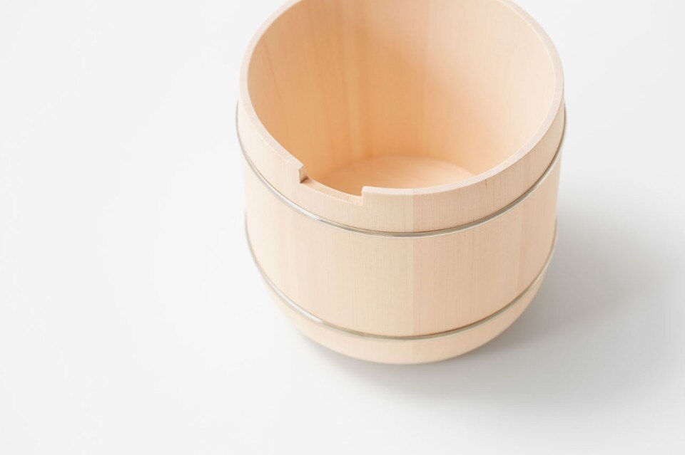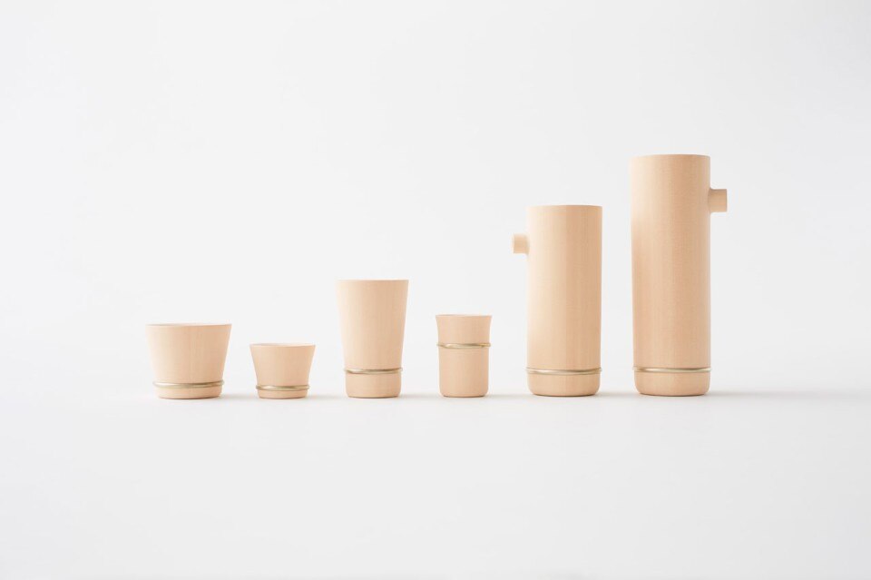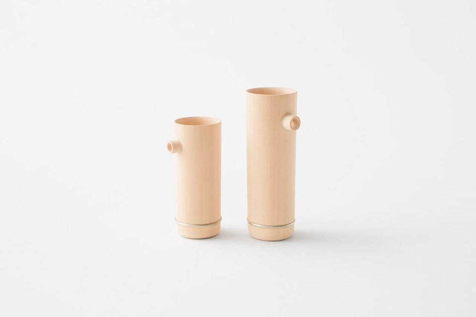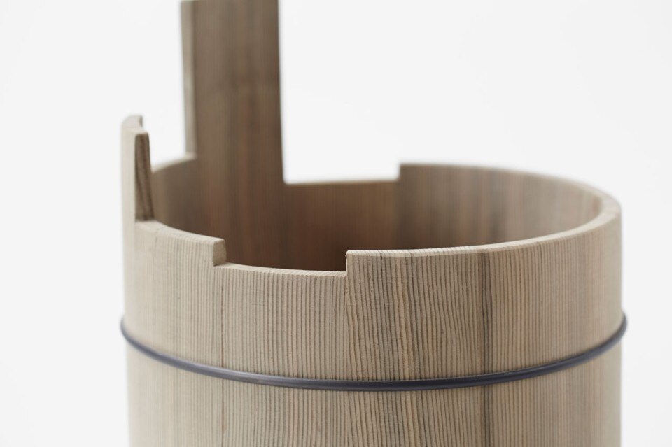 To soften the hoop’s metallic gleam, we sandblasted it to a matte texture then coloured it with a powdered paint, developing another new technique. The pieces are made from a combination of Japanese cypress (hinoki), the traditional material for buckets, and Jindai Cedar, a rare, darker wood uncovered from having been buried in the earth for more than 2,000 years. Nendo treated both woods with urethane to keep warping from ultraviolet rays, dirt and moisture to a minimum. A collection that combines old and new techniques to bring out the best in its materials.