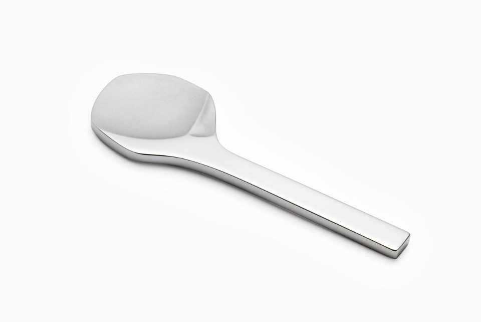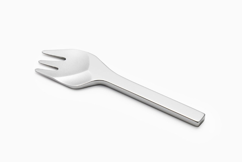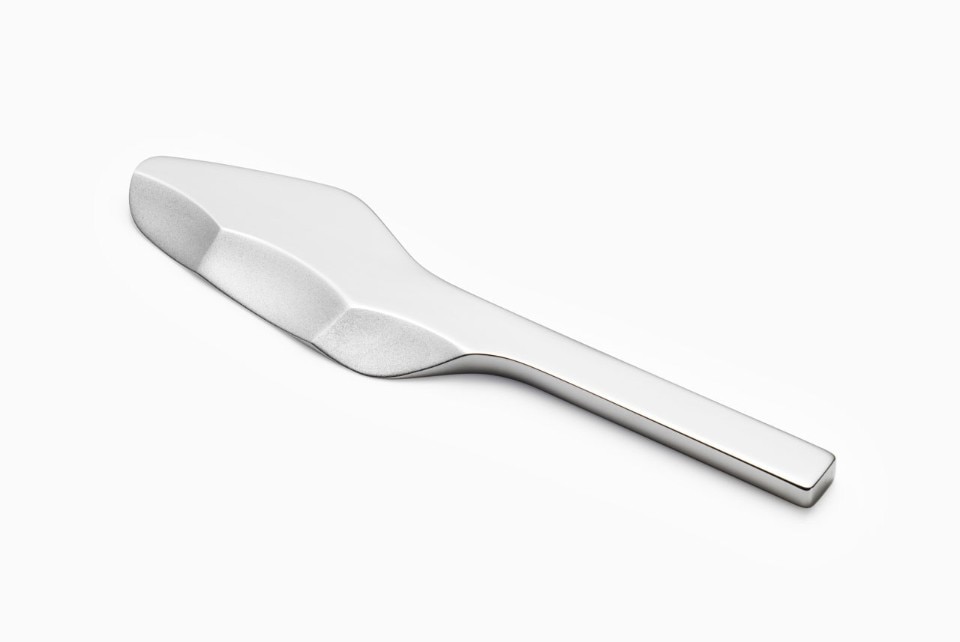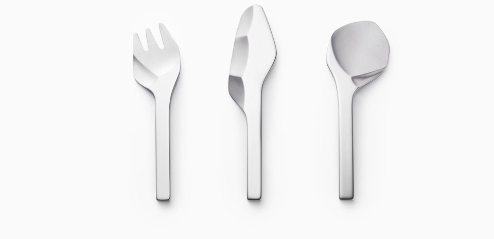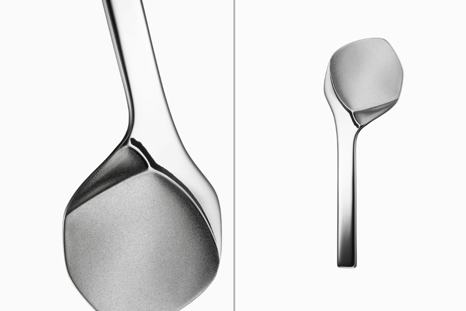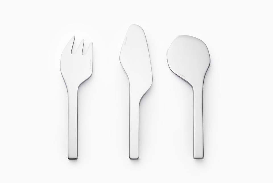 Nendo e Kobayashi Kogyo hanno progettato, per i grandi magazzini giapponesi Seibu, un set in tre pezzi di posate da dessert che esalta le potenzialità tecniche dell'azienda. Le silhouette del cucchiaio, della forchetta e del coltello sono state distorte e deformate, a ricordare gli attrezzi preistorici in selce. La difficoltà di realizzare queste forme grezze, molto differenti dalle configurazioni standard per le quali sono pensati i macchinari, ha fatto sì che la collezione venisse prodotta in maniera artigianale, facendo affidamento sulla sensibilità e sull'abilità delle maestranze. Per non enfatizzare esageratamente la somiglianza con la pietra, il peso e lo spessore dei pezzi è stato ridotto appiattendo il retro delle posate attraverso un processo di pressatura dei fogli di metallo. Le parti concave sono state quindi sabbiate, ottenendo una finitura opaca, mentre alle restanti parti è stata applicata una finitura a specchio, in modo che i pezzi appaiano scavati nel metallo.