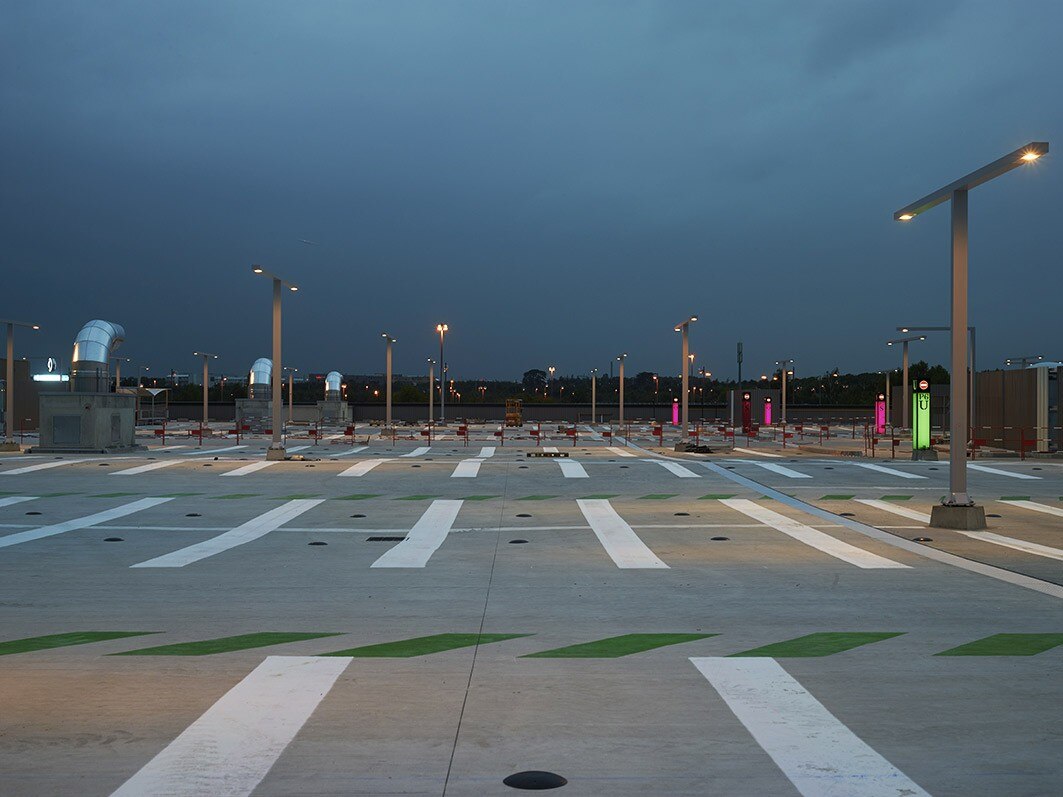 Il parcheggio è sia interrato che a livello della strada. Il progetto ha interessato una parte di terreno in pendenza, sfruttato come ingresso nord del parcheggio e per fornire allo stesso luce naturale e ventilazione. All’interno del complesso si trovano invece i posti auto per il personale e per il cinema. I dintorni sono liberi dai veicoli e sono stati piantumati per permettere la ricostituzione di un ecosistema.