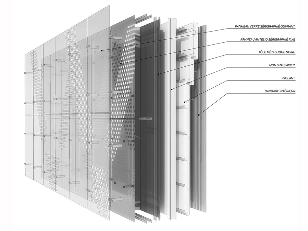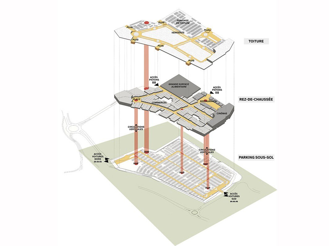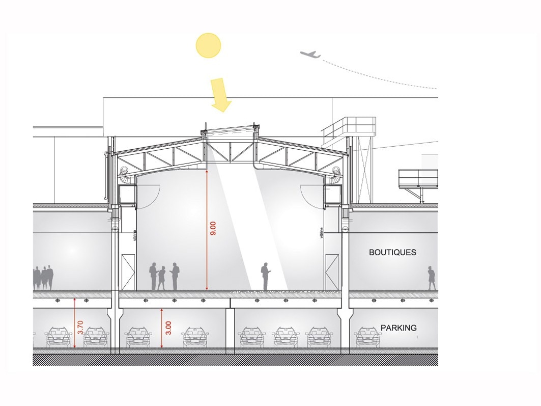 La progettazione architettonica si caratterizza per lo sviluppo dell’area commerciale su un unico livello, intorno a una strada coperta che disegna la forma di un otto, lungo la quale sono disposti gli spazi del programma funzionale. A questa strada interna si accede dalla rue des Buissons, di fronte alla fermata degli autobus e agli uffici della zona merci.