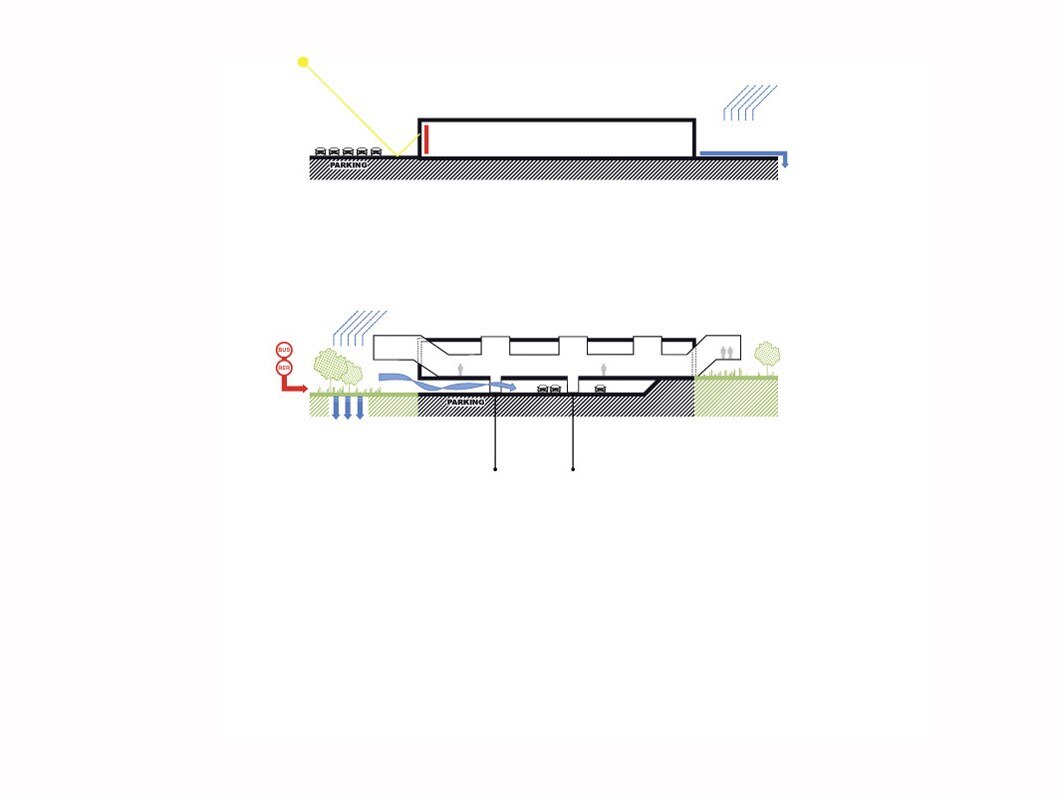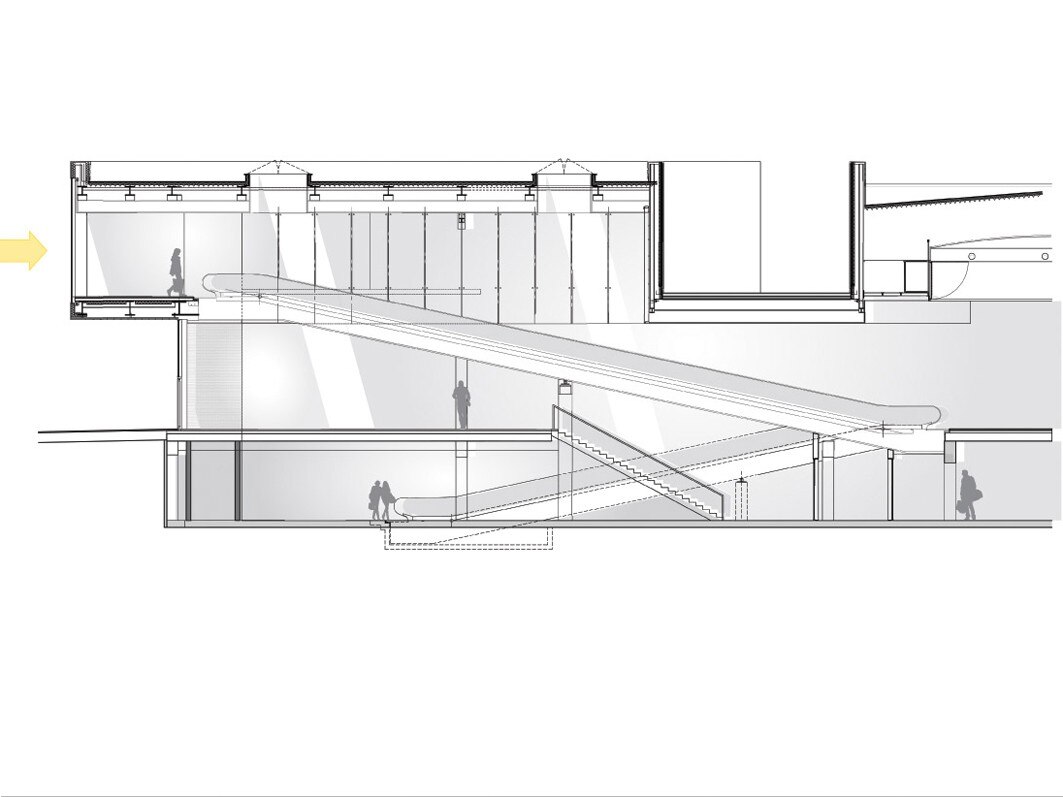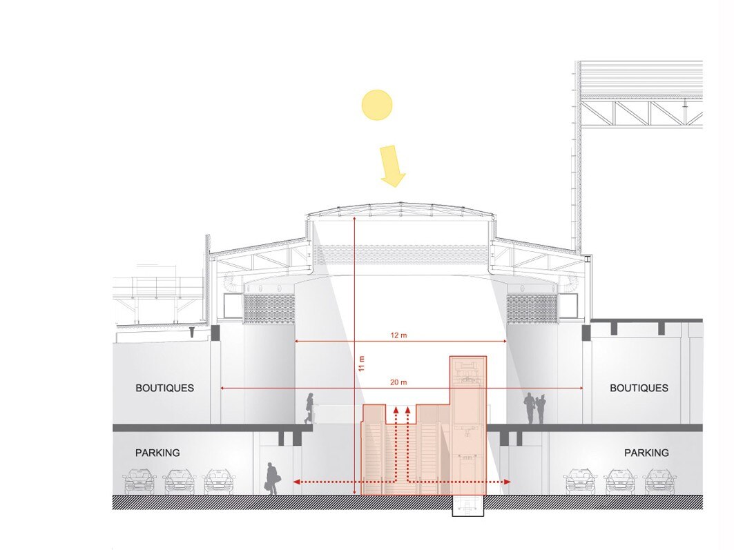 Simile all’interno di un aeroporto, la strada coperta è illuminata dalla luce naturale e offre la vista sul cielo attraverso il tetto in vetro progettato per ridurre l'illuminazione artificiale e per evitare il surriscaldamento termico. Il percorso si allarga in diversi punti a formare nodi più illuminati e aperti, in corrispondenza con i punti più alti del soffitto, che corrispondono ai cinque punti di collegamento verticale tra il parcheggio e il centro: gli hub. Il percorso di 1,1 km di lunghezza è ampiamente illuminato da finestre continue ed è scandito dal ritmo spigato dei disegni della facciata.