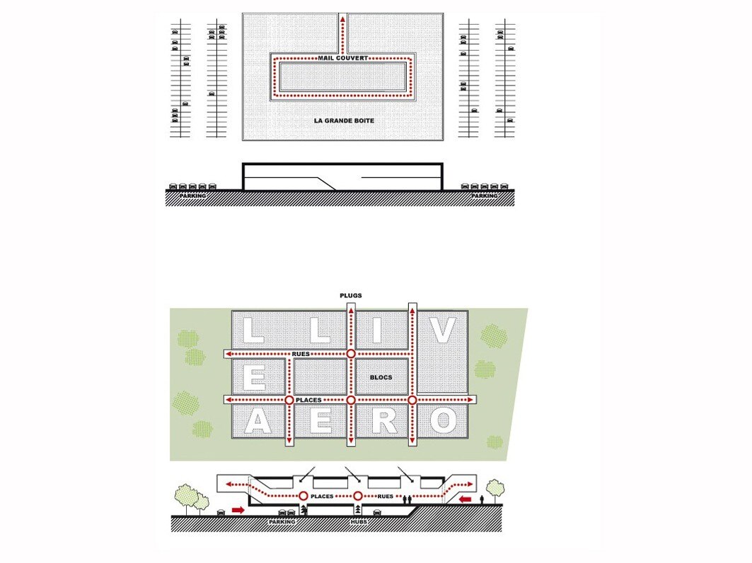 Aeroville, spazio commerciale e ricreativo ispirato all’immaginario del viaggio sarà il nuovo “centro” di questa vasta zona precedentemente indistinta. Costituito da blocchi frammentati, è uno spazio aperto a cui l’aeroporto instilla la dimensione cosmopolita del viaggio e la città quella del flusso e della moltitudine di attività. L’aeroporto è lo spazio iconico di una nuova cultura migratoria globale, Aeroville è una metafora del viaggio che unisce questa fruibilità globale.
