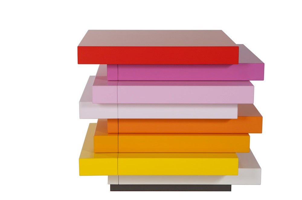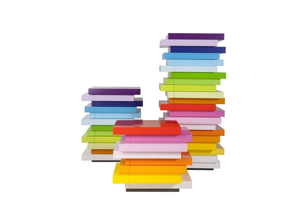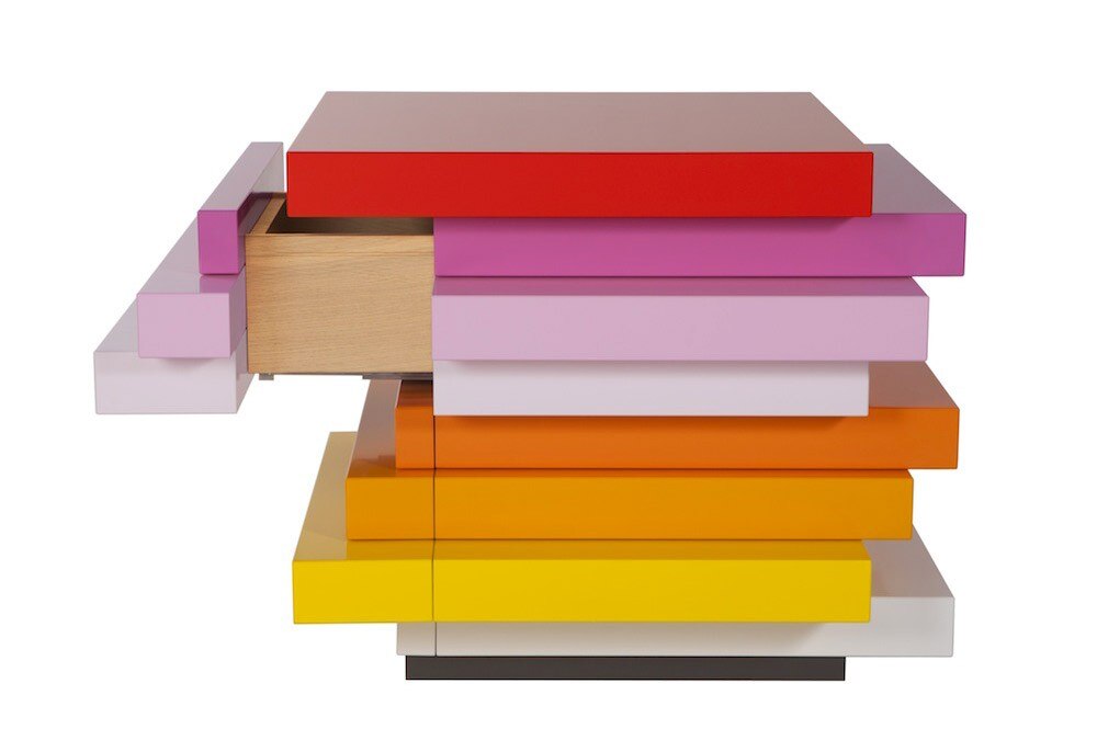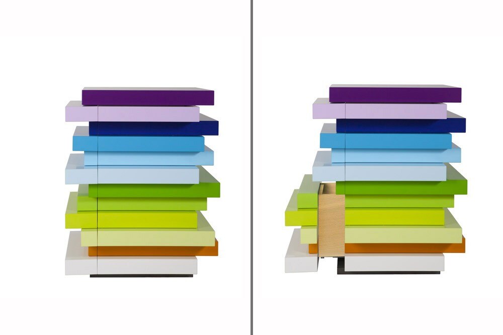 Mille-Feuille è realizzato artigianalmente con strati di MDF laccato ed è disponibile in tre misure, 21 strati per la struttura multicolore, 12 strati per il mobile basso verde-blu e 8 strati per il comodino sui toni del giallo e del rosa, tutti con cassetti nascosti. La funzione di Mille-Feuille varia in base al numero di strati e il concept si presta a essere sviluppato per altre funzioni, quali un tavolino o un ripiano.