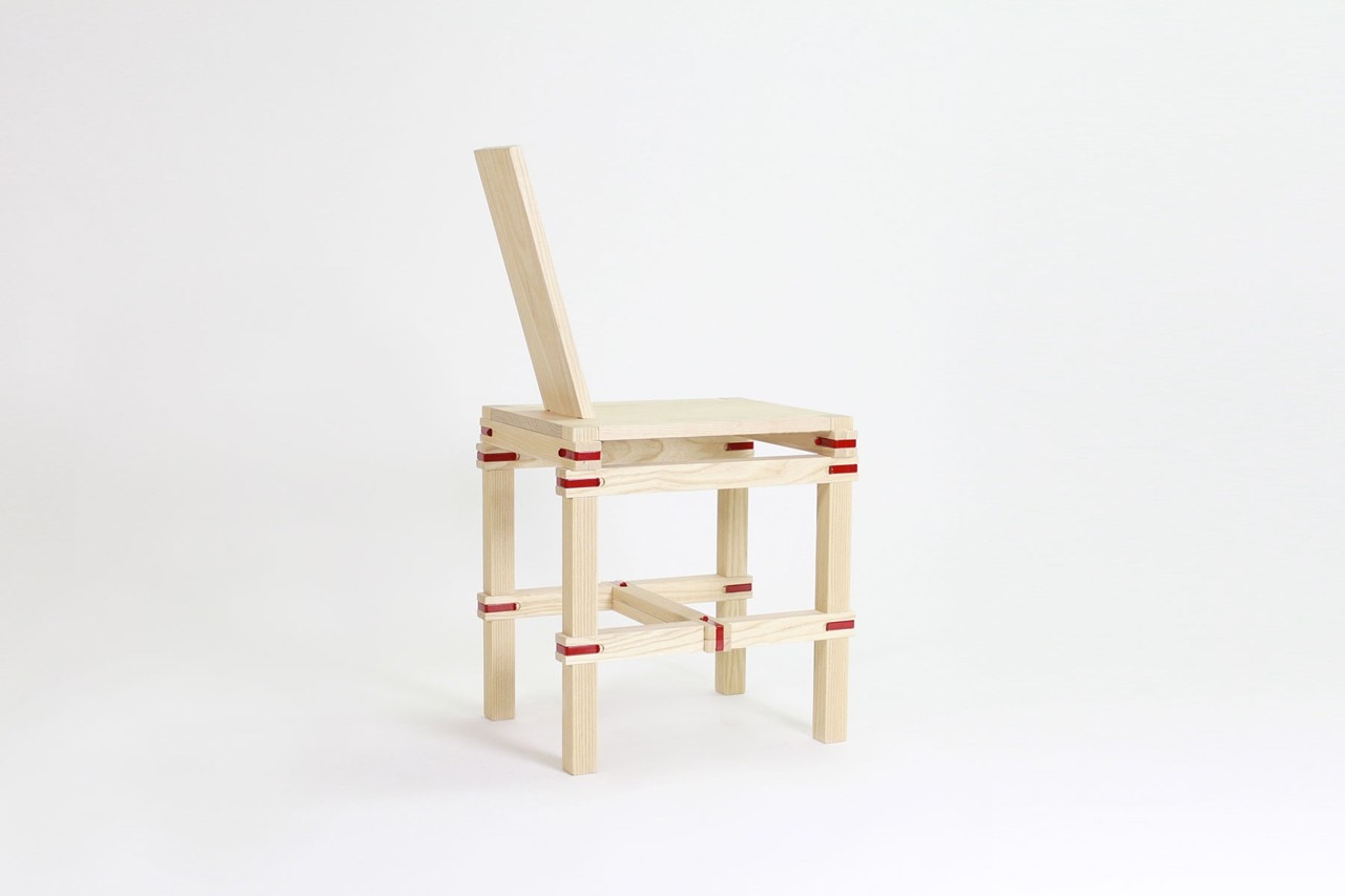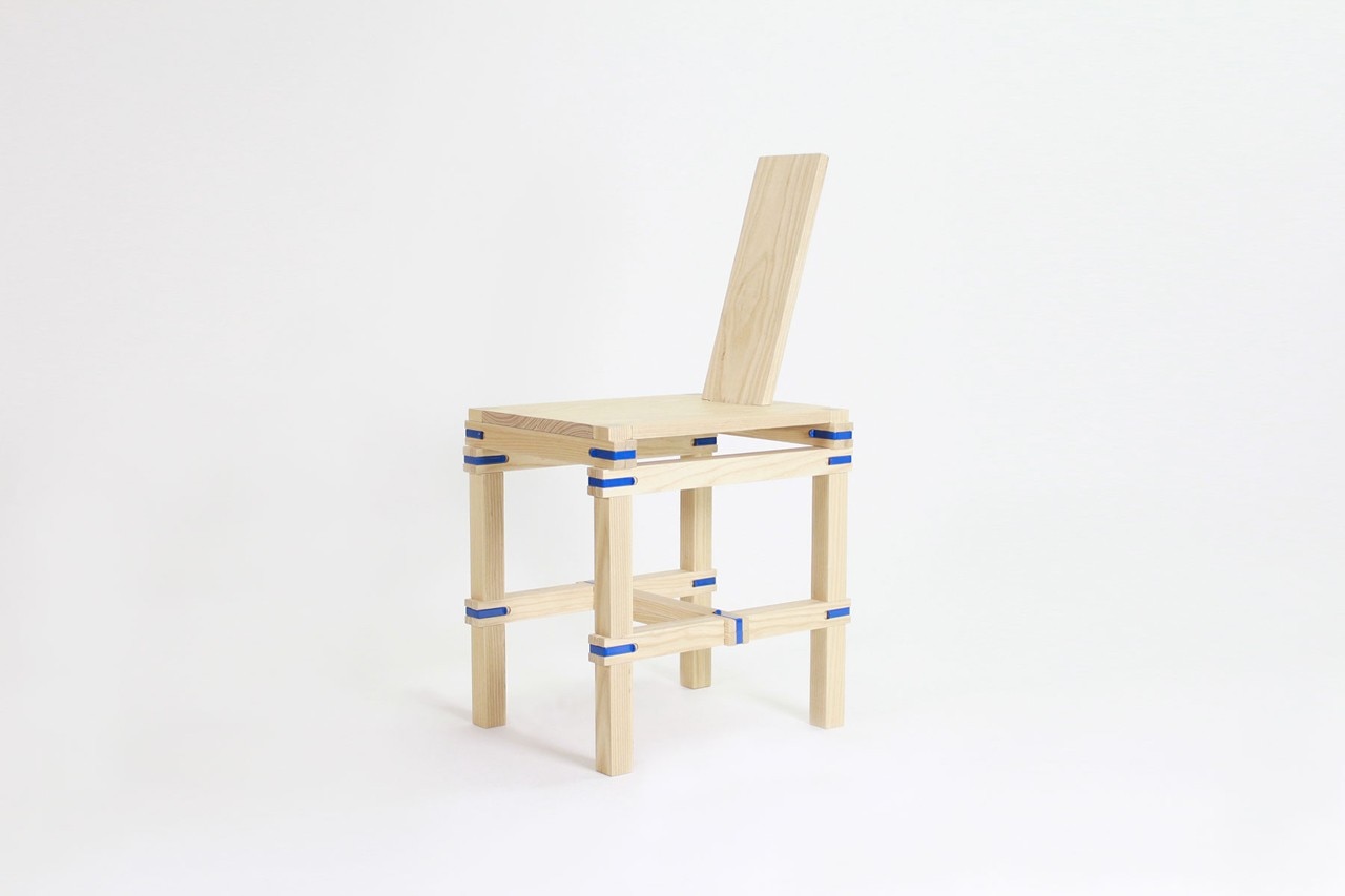 Materiali: massello di frassino e acciaio verniciato a polvere (sedia), pelle e cricchetti (zaino)