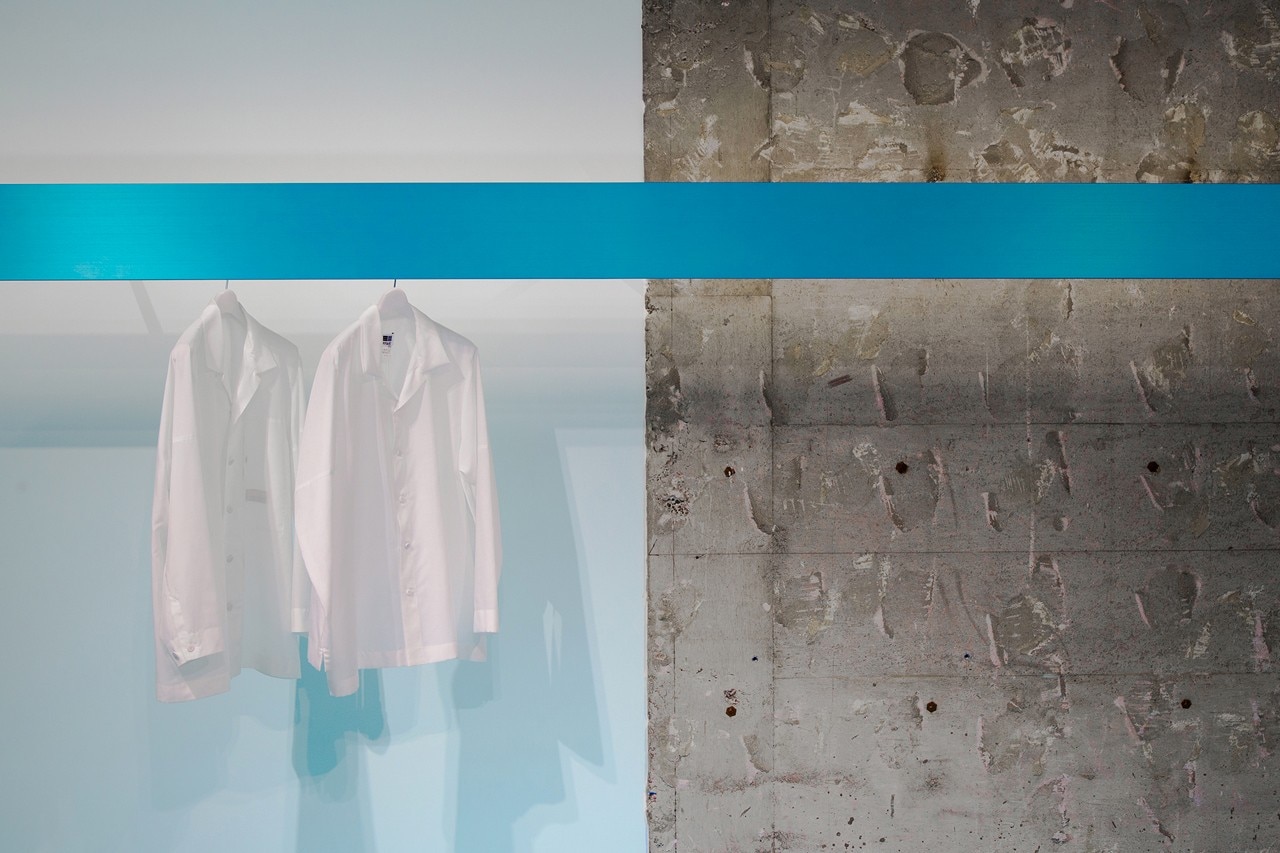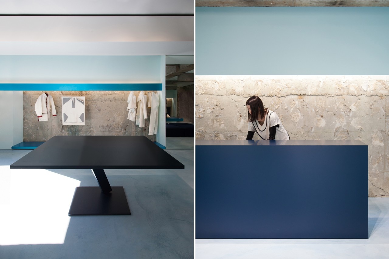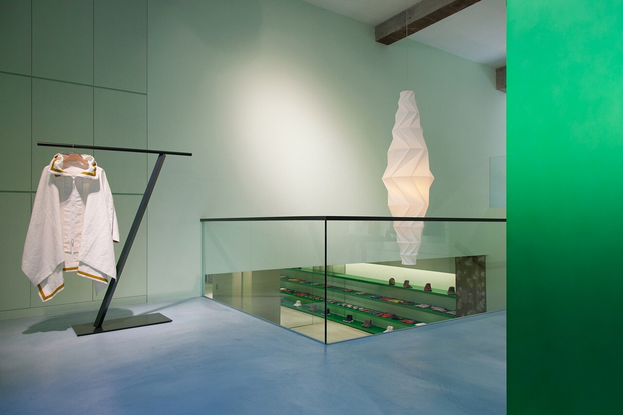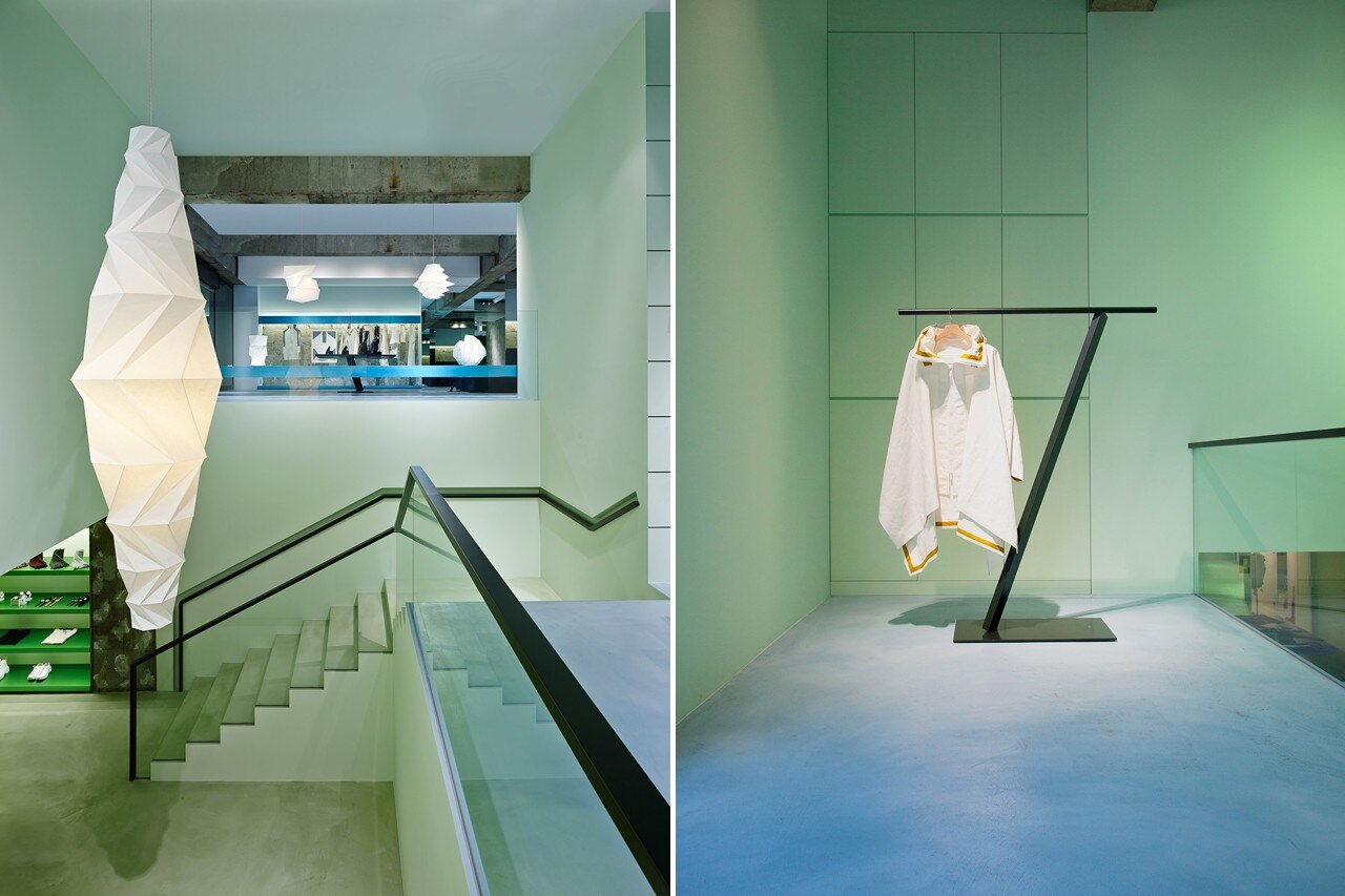 Il vetro è usato per separare i livelli e gli spazi di vendita; mentre i capi di abbigliamento appesi ai binari nascosti da pannelli in alluminio dipinti e illuminati dai neon, sembrano fluttuare. Gli accessori poggiano su mensole metalliche.