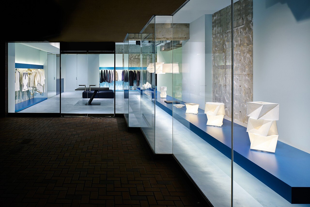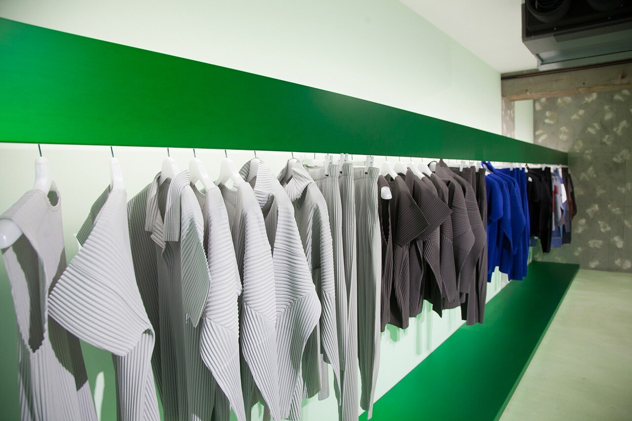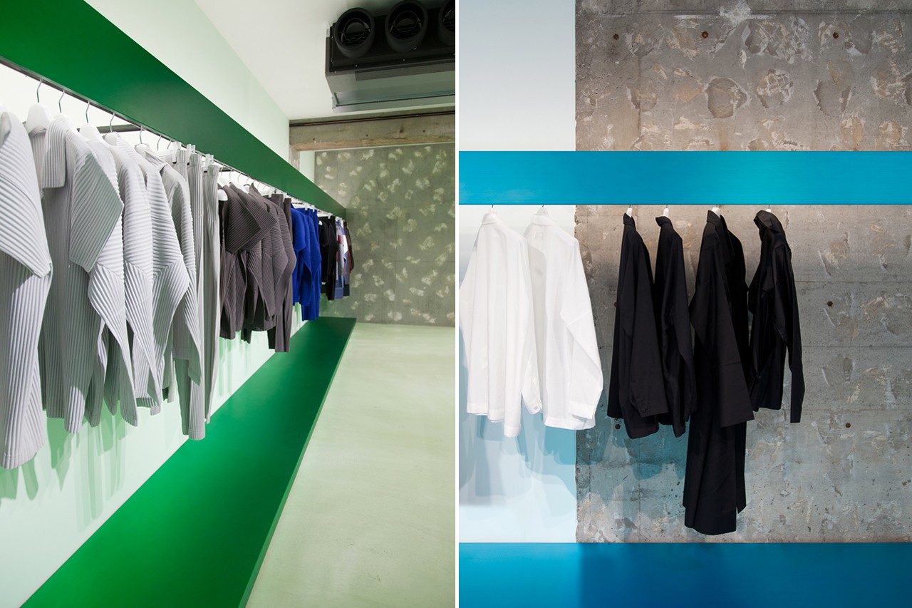 Il negozio si articola su più livelli, distinti in tre spazi aperti; dove ciascun ambiente è dedicato all’esposizione di una particolare linea della collezione di Issey Miyake.
