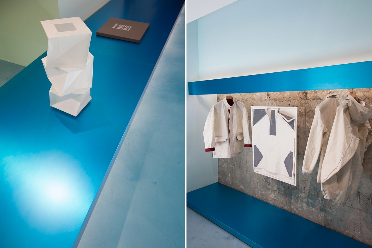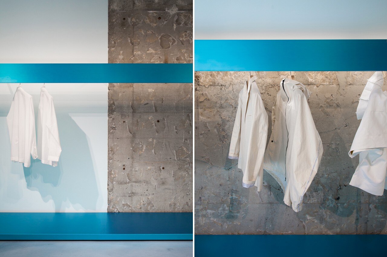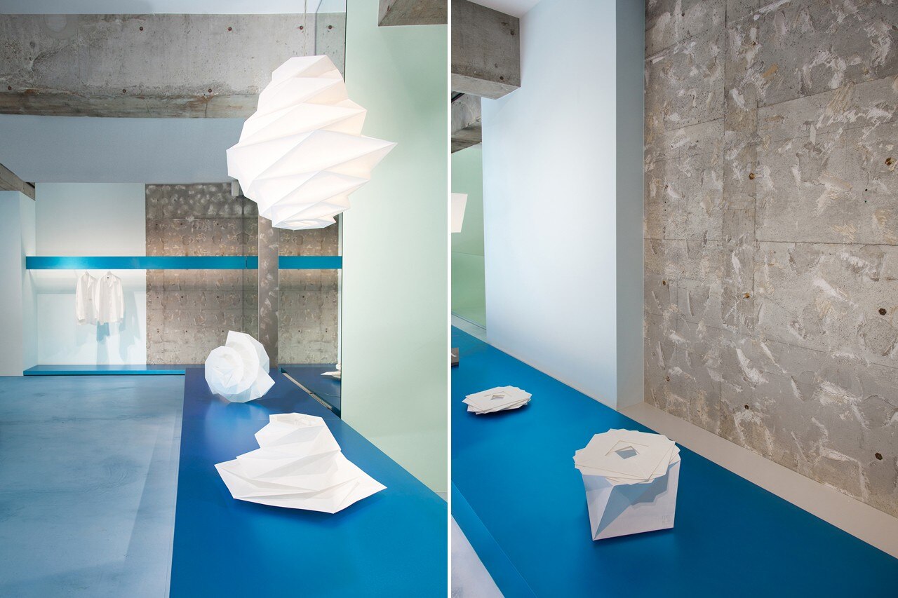 Il negozio si articola su più livelli, distinti in tre spazi aperti; dove ciascun ambiente è dedicato all’esposizione di una particolare linea della collezione di Issey Miyake.