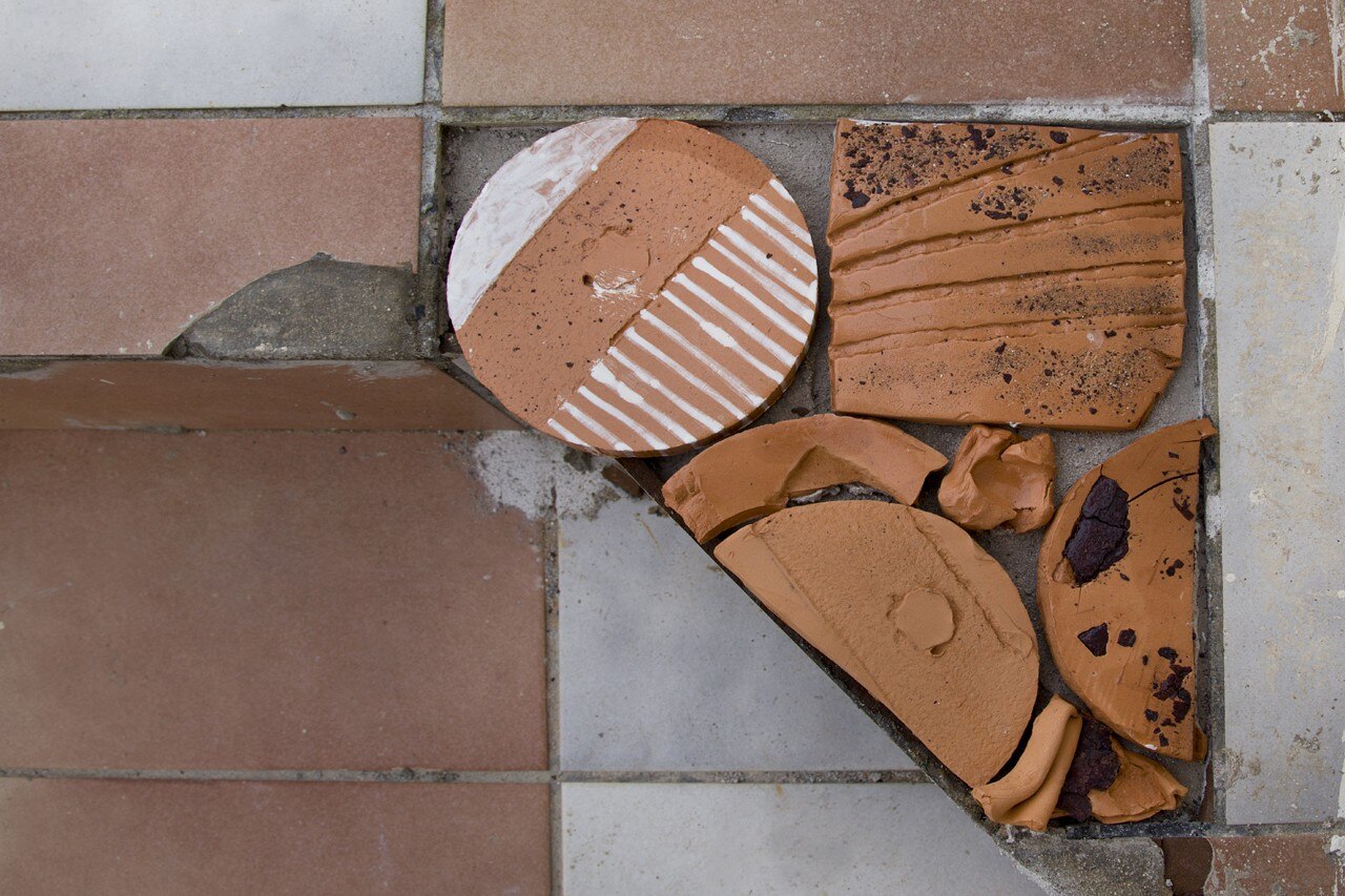 L’attenzione per ciò che “resta” è fissata su carta attraverso l’immagine di un elemento scultoreo, in questo caso un frammento di piastrella raccolto a testimonianza della storia architettonica dell’edificio, e rimanda all’opera dell’artista che, durante il corso della residenza, ha realizzato una serie di formelle in ceramica con le quali sostituire i pezzi collezionati.