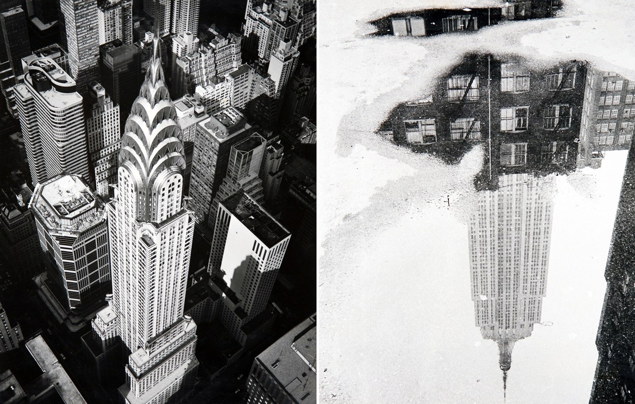 A sinistra: Marilyn Bridges, Chrysler Building, N.Y, 1988, Raccolta della fotografia, Galleria civica di Modena; © Marilyn Bridges. A destra: André Kertész, Puddle, New York, 1967, Raccolta della fotografia, Galleria civica di Modena, © Estate of André Kertész
