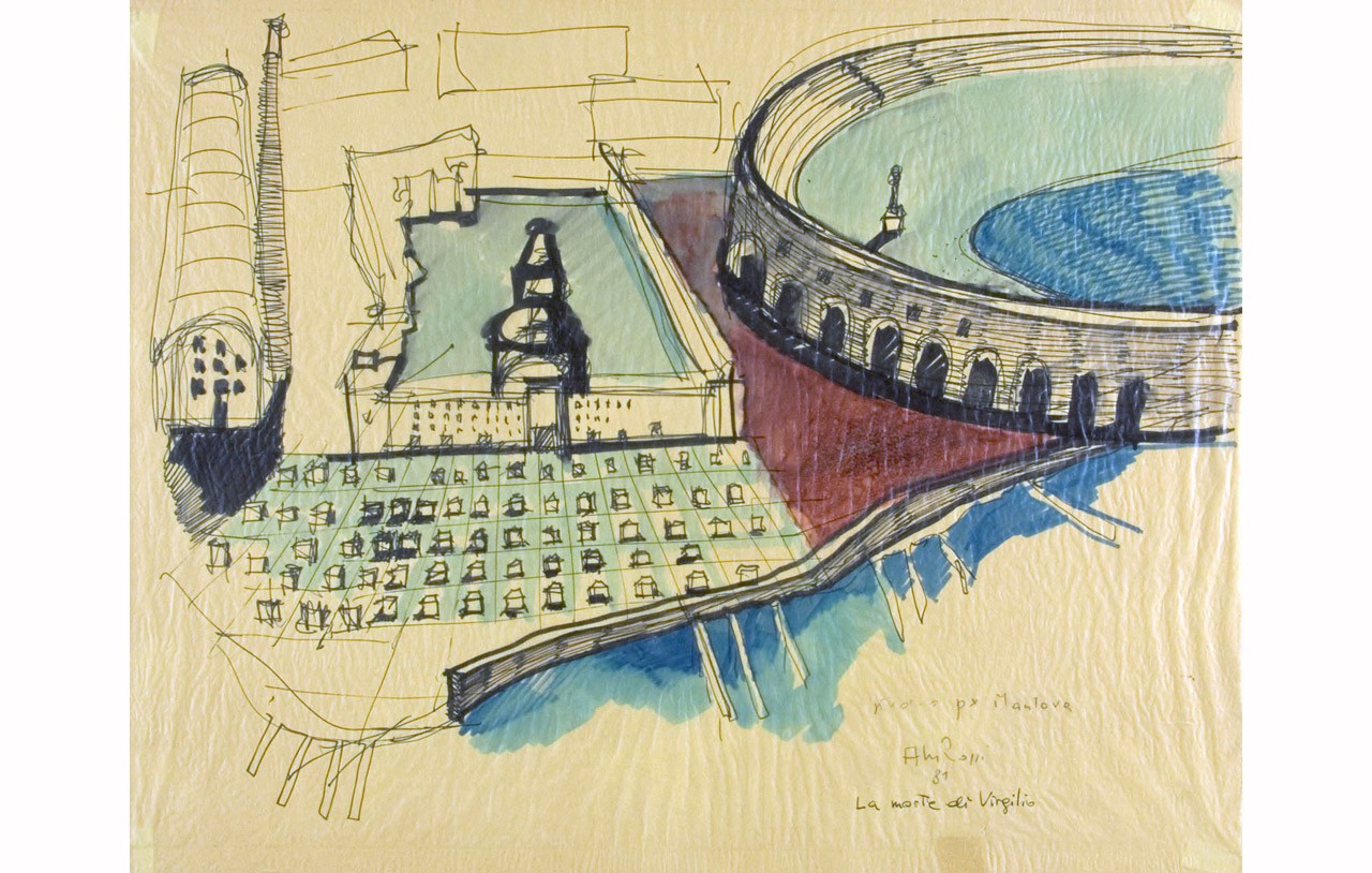 Aldo Rossi, <>Studio per Mantova, 1981, china, pennarello acquerellato su carta, Raccolta del disegno, Galleria civica di Modena, © Eredi Aldo Rossi