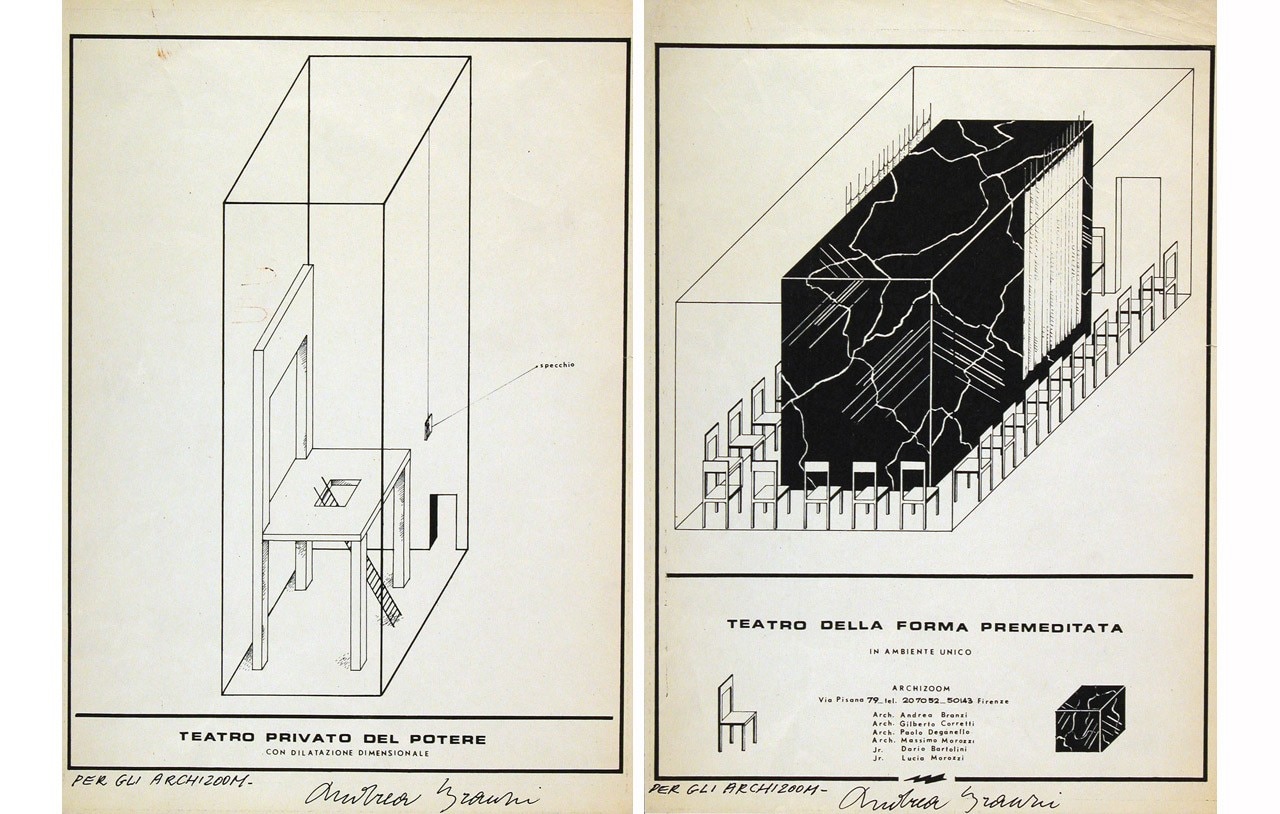 A sinistra: Andrea Branzi per Archizoom, Teatro segreto in ambiente domestico, 1969, eliografia, Raccolta del disegno, Galleria civica di Modena, © Andrea Branzi. A destra: Andrea Branzi per Archizoom, Teatro della forma premeditata, 1969, eliografia, Raccolta del disegno, Galleria civica di Modena, © Andrea Branzi.