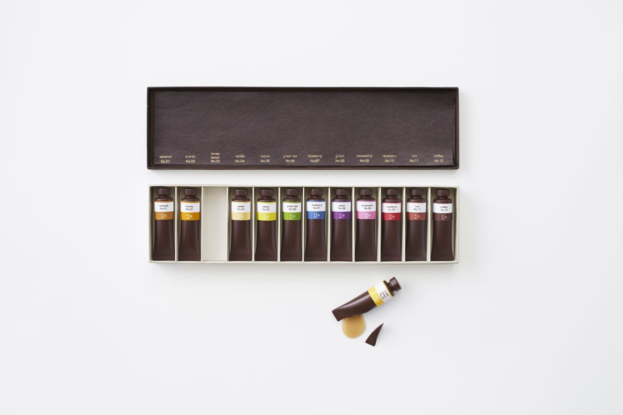 L’etichetta indica il gusto di ogni cioccolatino e funziona anche come un involucro che permette di mangiare il cioccolatino senza sporcarsi le mani. Il progetto di Nendo combina l’emozione infantile di aprire una scatola di colori con l’ebbrezza di aprire una confezione di cioccolatini donata inaspettatamente.