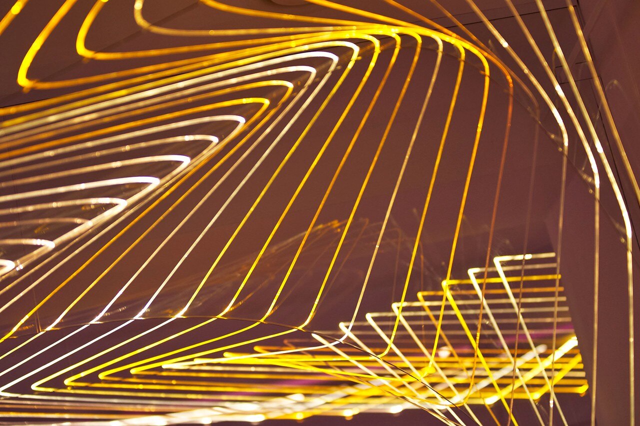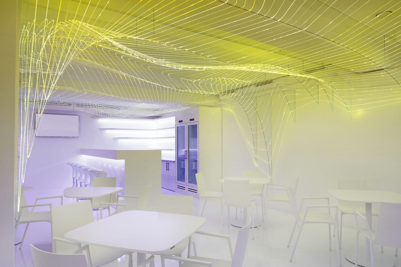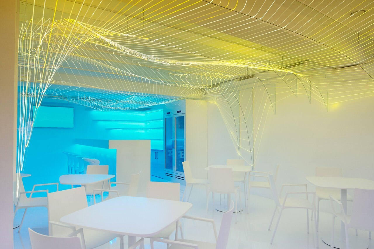 Il progetto gioca con luci cangianti, colori e riflessi inscritti in una struttura ondulata di fibre ottiche, enfatizzata dalla monocromaticità dell’ambiente e concepita utilizzando un metodo di progettazione parametrica.