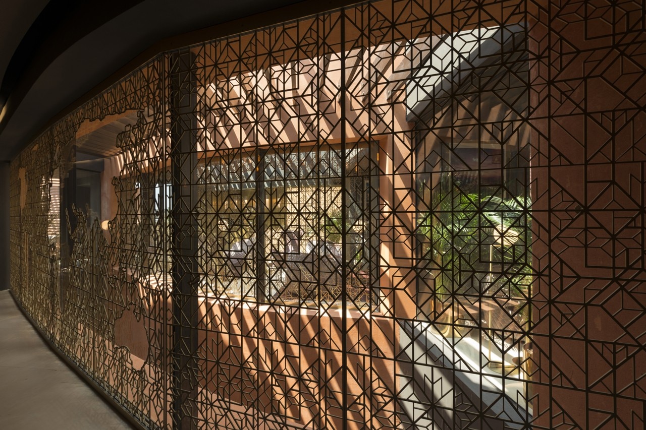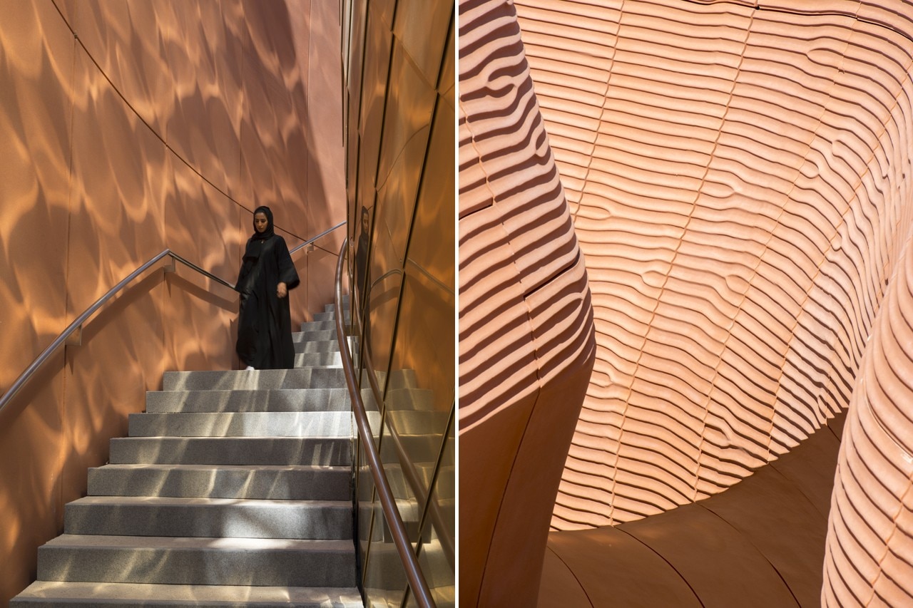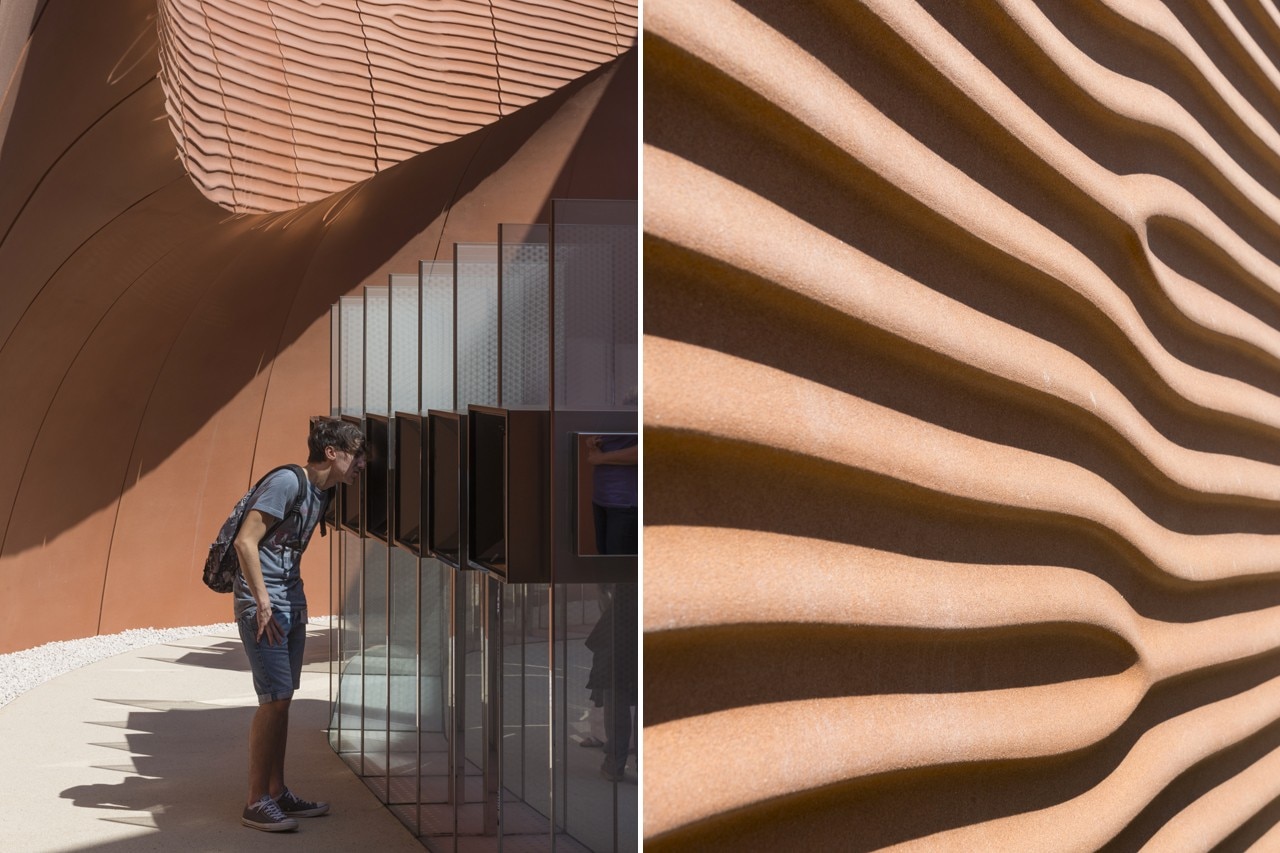 Le pareti proseguono per tutti i 140 metri del lotto, unificando gli spazi con un linguaggio formale dinamico studiato per evocare le creste e la trama delle dune di sabbia. Per trasmettere la peculiarità del luogo, la consistenza delle pareti deriva da un’immagine scansita del deserto e la costruzione utilizzerà materiali capaci di rappresentare le diverse sfumature di sabbia degli Emirati. I pannelli in GRC sono supportati da un telaio in acciaio che può essere facilmente smontato e ricostruito altrove.