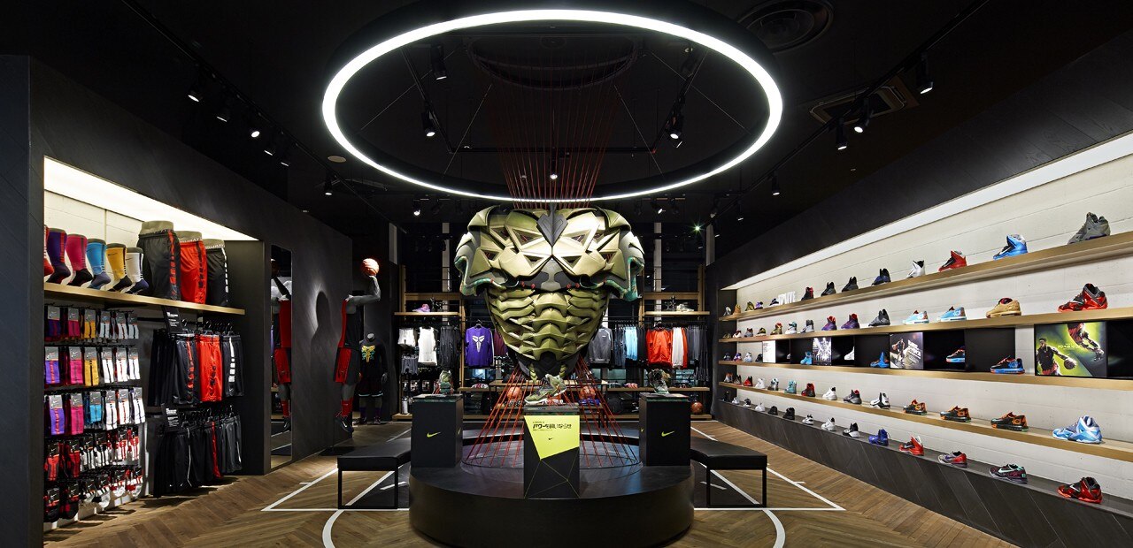 Il negozio ricrea un ambiente dove le persone possono sentirsi circondate dal mondo del basket. Il campo da gioco diventa il riferimento chiave della progettazione: un lampadario circolare e l’altezza degli espositori sono impostati a 3,05 metri dal pavimento, pari all’altezza del canestro nei campi da basket.