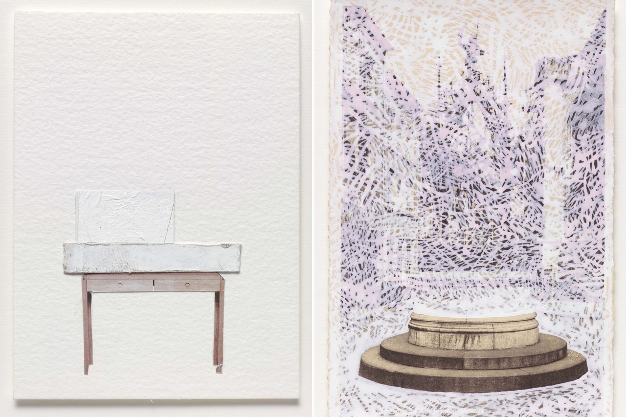 A destra: Rachel Whiteread, Untitled, 2005. Collage e gouache su carta per acquarello, 15.2 x 10.5 cm. Courtesy Galleria Lorcan O’Neill Roma. A sinistra: Rachel Whiteread, Antwerp, 2002. Inchiostro su cartolina, 14 x 9 cm. Courtesy Galleria Lorcan O’Neill Roma