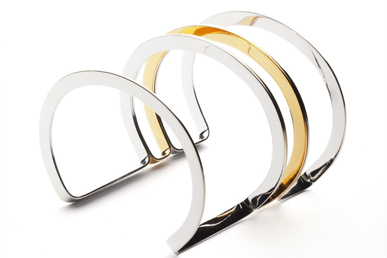 Liaison ha una struttura più semplice: alle dimensioni tipiche del bracciale “alla schiava” affianca una ricerca verso la riduzione del peso e della quantità di materiale. È caratterizzato da tre elementi di lunghezze diverse, realizzati in lamina d’argento, curvati e saldati tra loro; di questi l’elemento centrale è placcato in oro e vuole rappresentare in modo simbolico la preziosità dell’incontro tra i due elementi in argento, figura metaforica dell’incontro tra due persone.