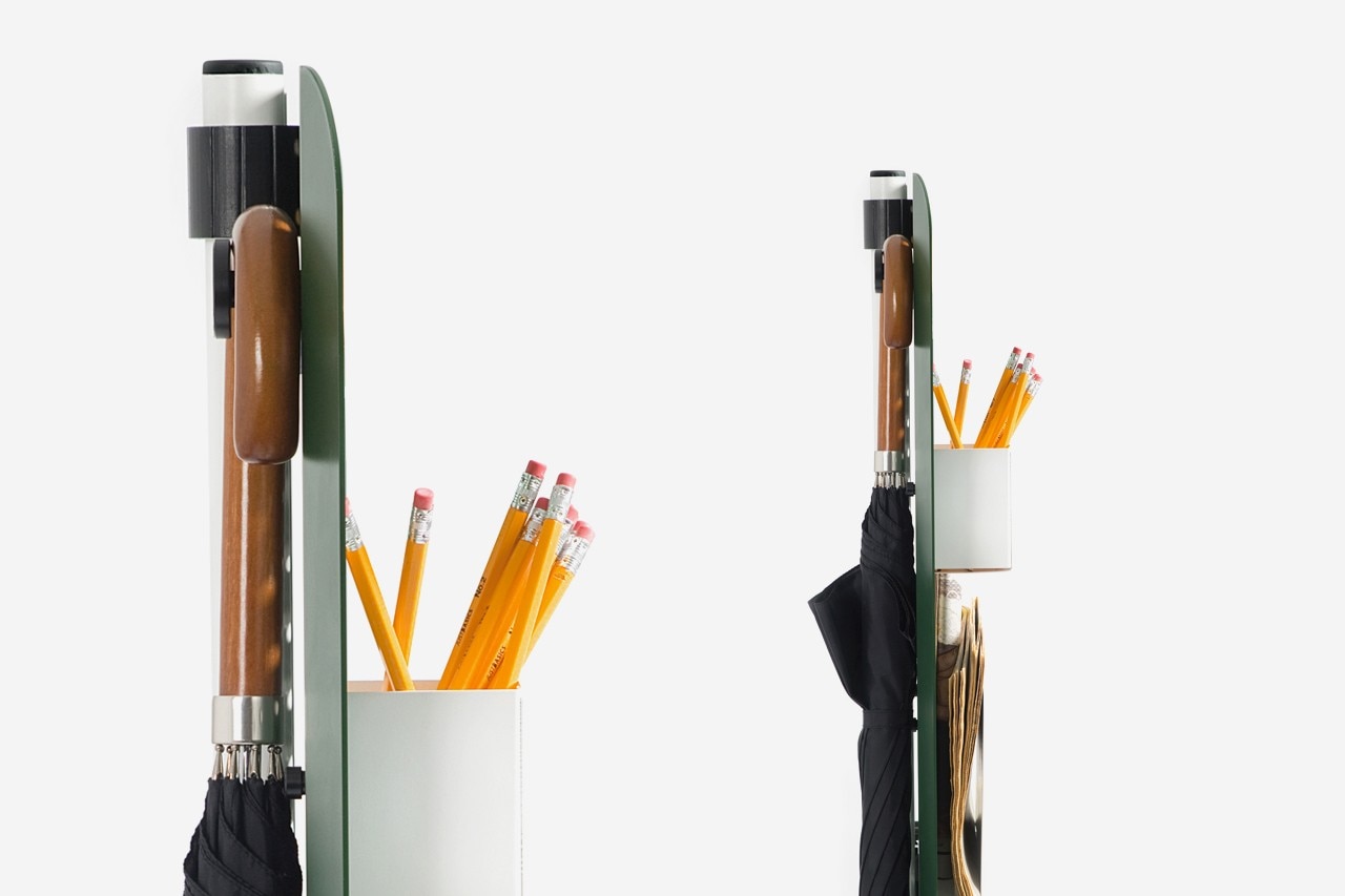 I diversi elementi sono appesi al pannello con dei piccoli ganci che l’utente può spostare dove preferisce. Realizzati in nylon, questi ganci non logorano il pannello metallico, che include anche una presa collegata alla rete elettrica e può essere personalizzato con l’inserimento di moduli per la connessione dati, HMDI o USB.
