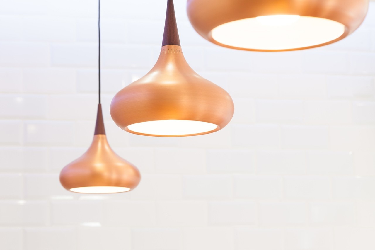 Tubi in rame e cilindri in acciaio inossidabile, presi a prestito dall’industria della birra, sono stati assemblati per creare espositori simili ai modelli scientifici delle strutture molecolari, elementi centrali di tutto il progetto. Sopra il bancone sono sospese quattro lampade disegnate da Jo Hammerborg, rivisitazione di un progetto del 1963, rivestite in rame e simili a gocce di cioccolato.