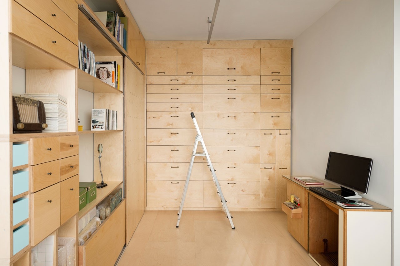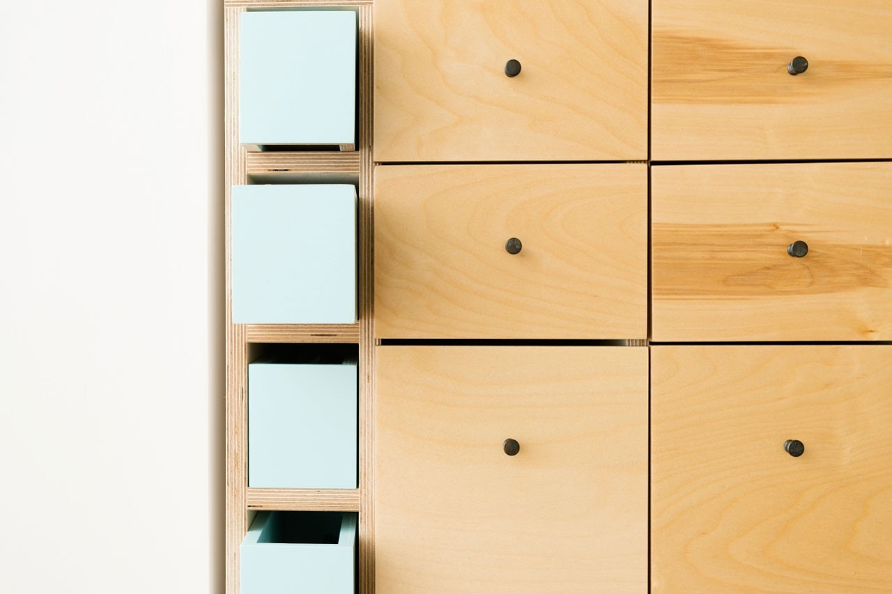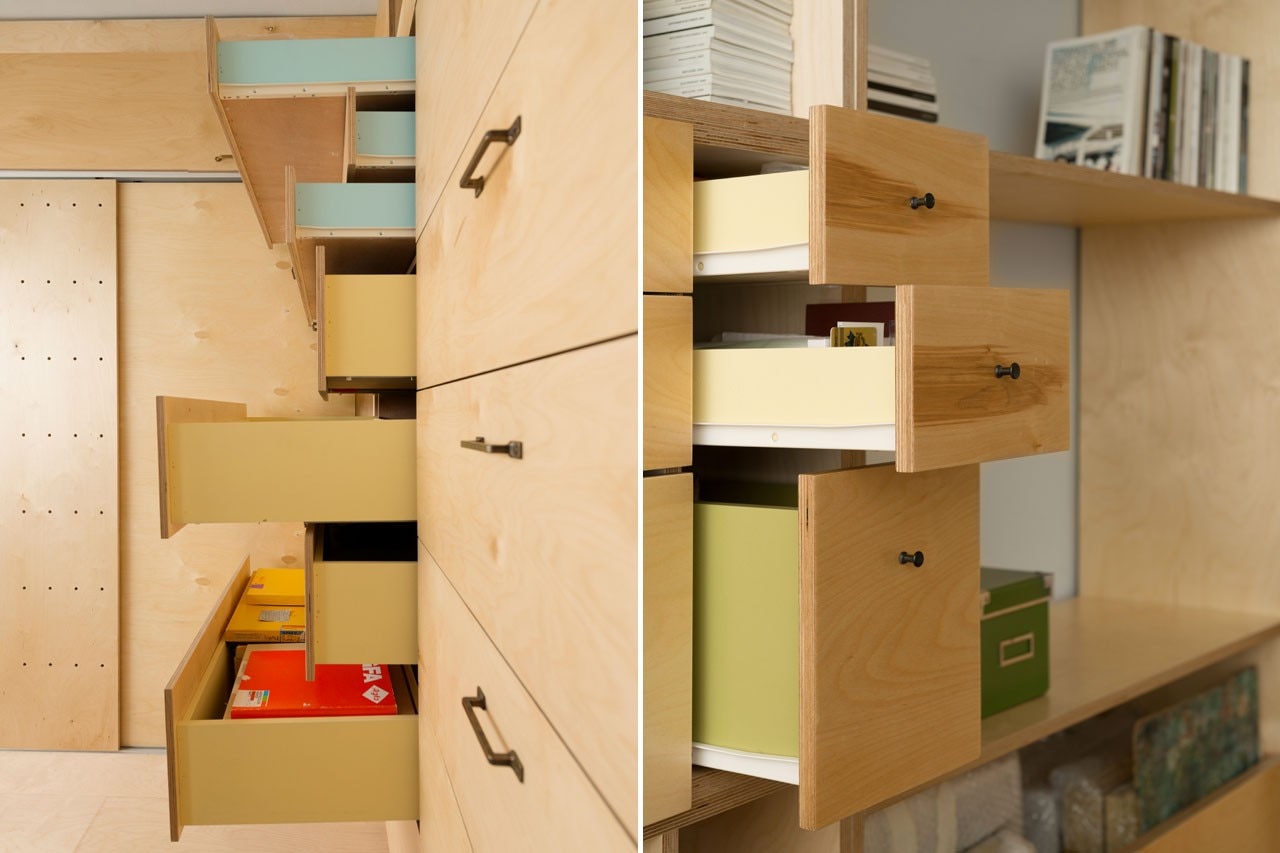 In seguito alle misurazioni effettuate sono state ottenute quattro famiglie di proporzioni. Ogni cellula, armadio o cassetto dello studio è stato pensato in base a queste proporzioni e dipinto all’interno secondo un colore identificativo della “famiglia”. Altre sezioni sono invece dedicate ad accogliere gli strumenti e i materiali di lavoro. Gli elementi più piccoli possono essere rimossi dalla parete attrezzata che li contiene e usati come contenitori da tavolo. Le ante scorrevoli sono costitute da lastre di pallet che possono essere utilizzate per appendere le opere o come cavalletti modulari.