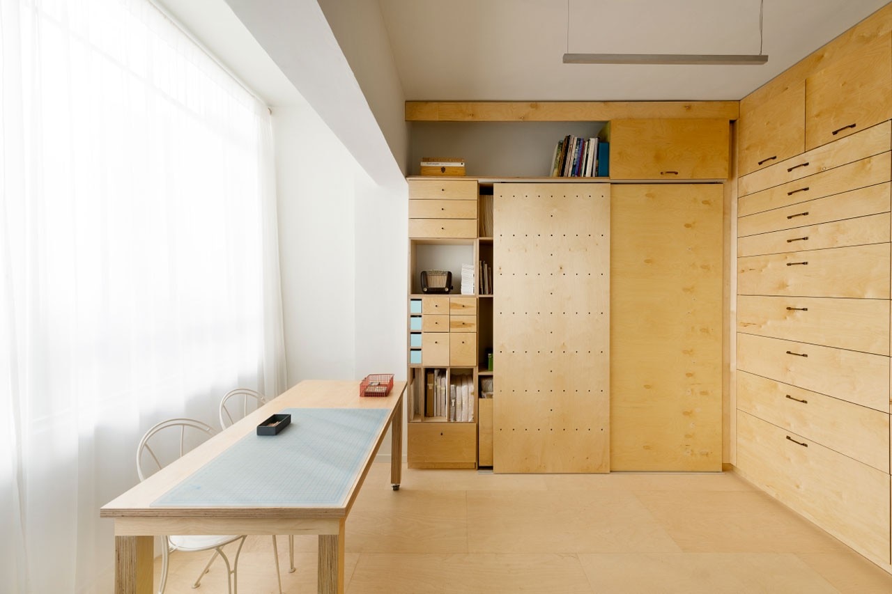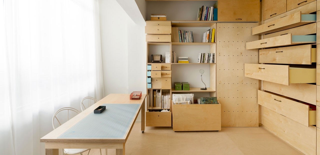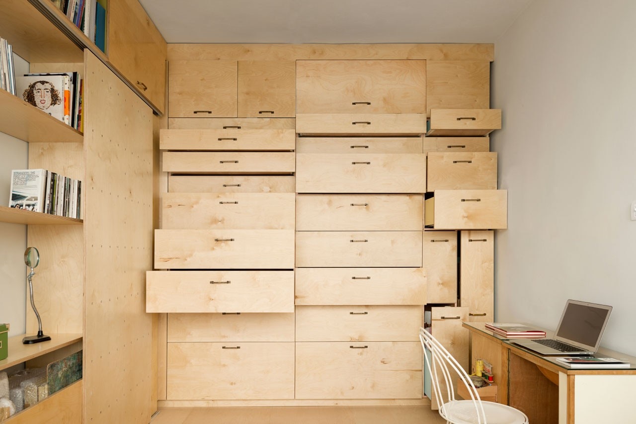 In seguito alle misurazioni effettuate sono state ottenute quattro famiglie di proporzioni. Ogni cellula, armadio o cassetto dello studio è stato pensato in base a queste proporzioni e dipinto all’interno secondo un colore identificativo della “famiglia”. Altre sezioni sono invece dedicate ad accogliere gli strumenti e i materiali di lavoro. Gli elementi più piccoli possono essere rimossi dalla parete attrezzata che li contiene e usati come contenitori da tavolo. Le ante scorrevoli sono costitute da lastre di pallet che possono essere utilizzate per appendere le opere o come cavalletti modulari.