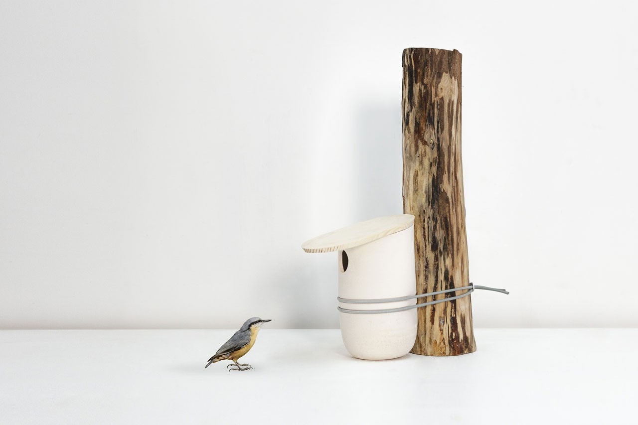 Mikko è una collezione di casette per ospitare e sfamare gli uccelli realizzata in legno e ceramica dai giovani designer dello studio francese Pygmalion.