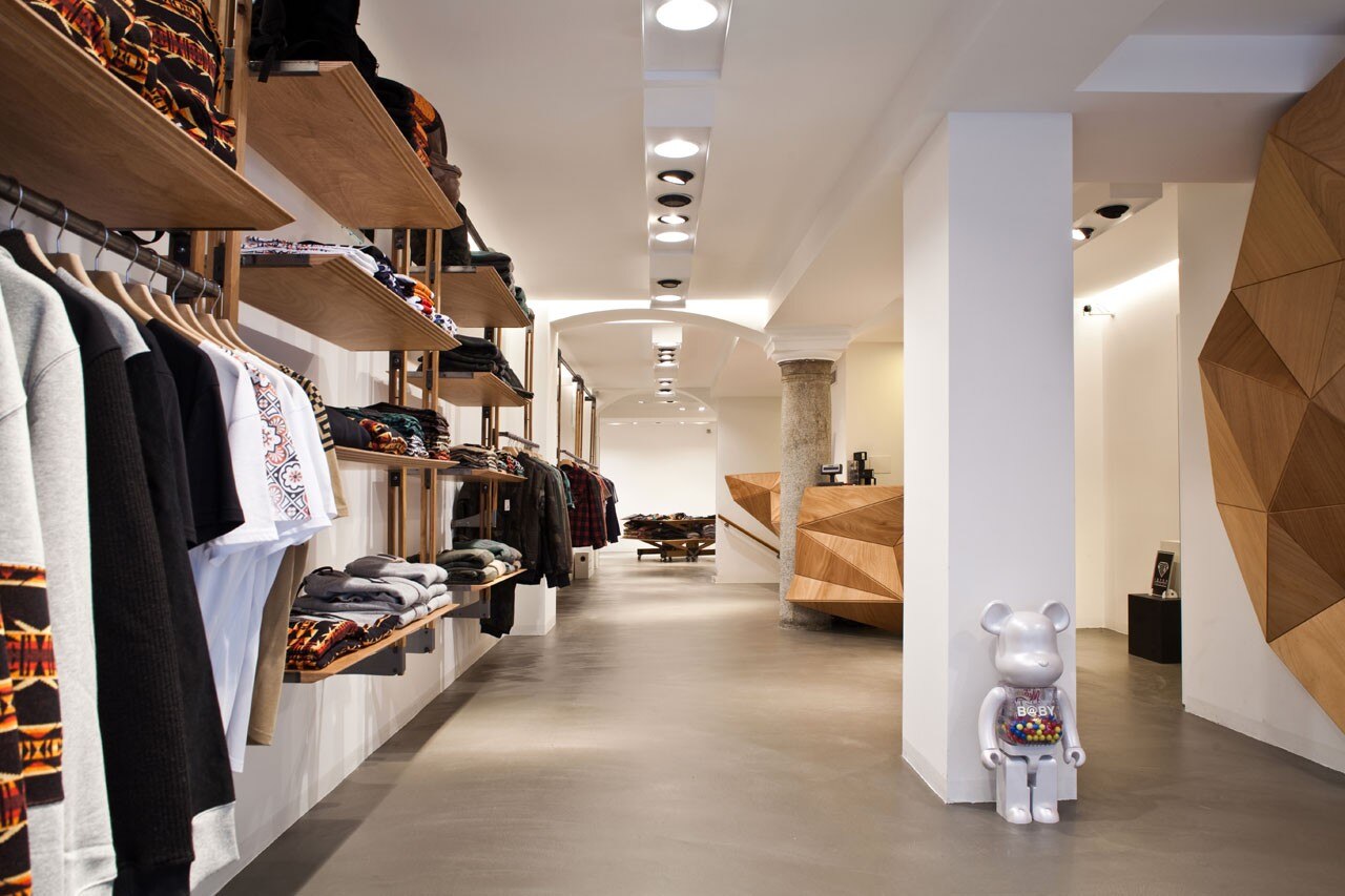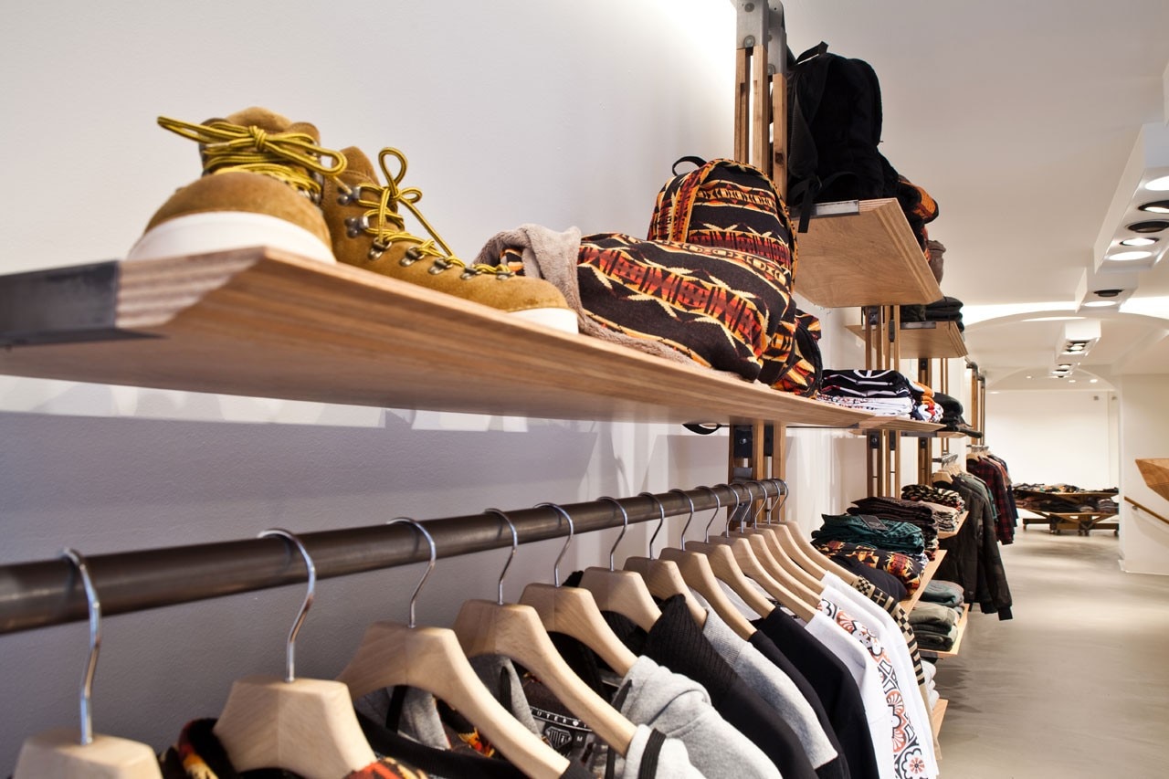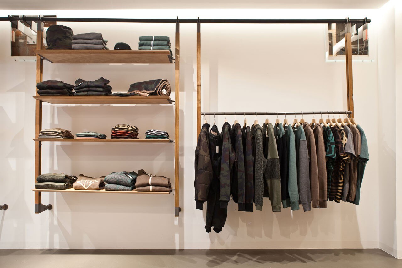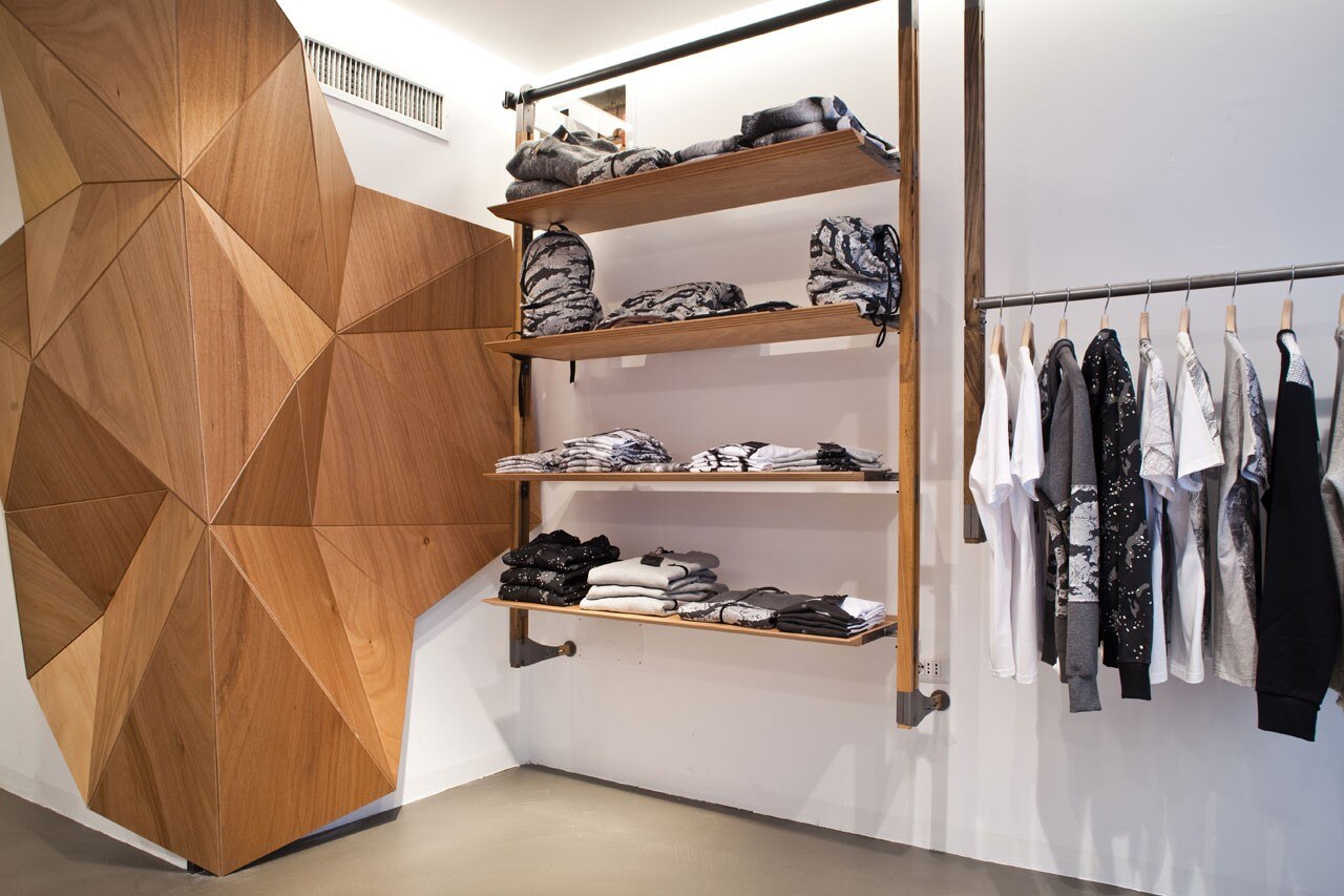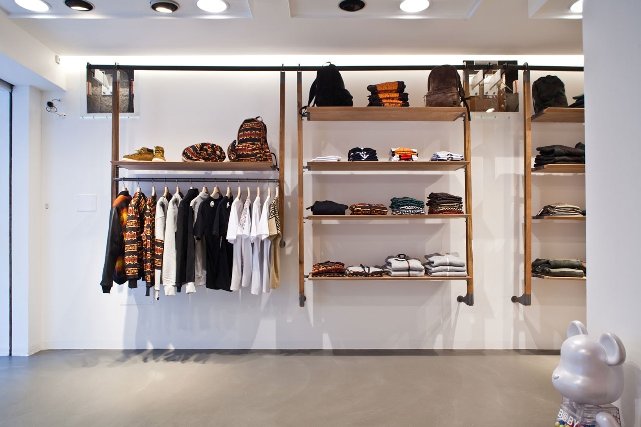 Tutti i capi sono esposti su elementi sospesi che fuoriescono dalle pareti portanti originarie, protette da un rivestimento in cartongesso ma ancora visibili attraverso piccole porzioni vetrate alle quali sono ancorati i supporti in legno degli appendiabiti.