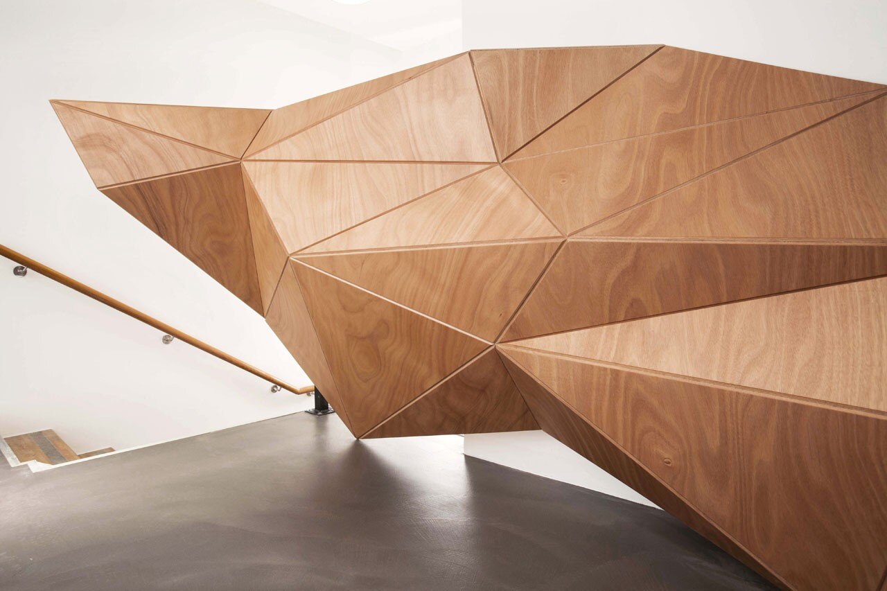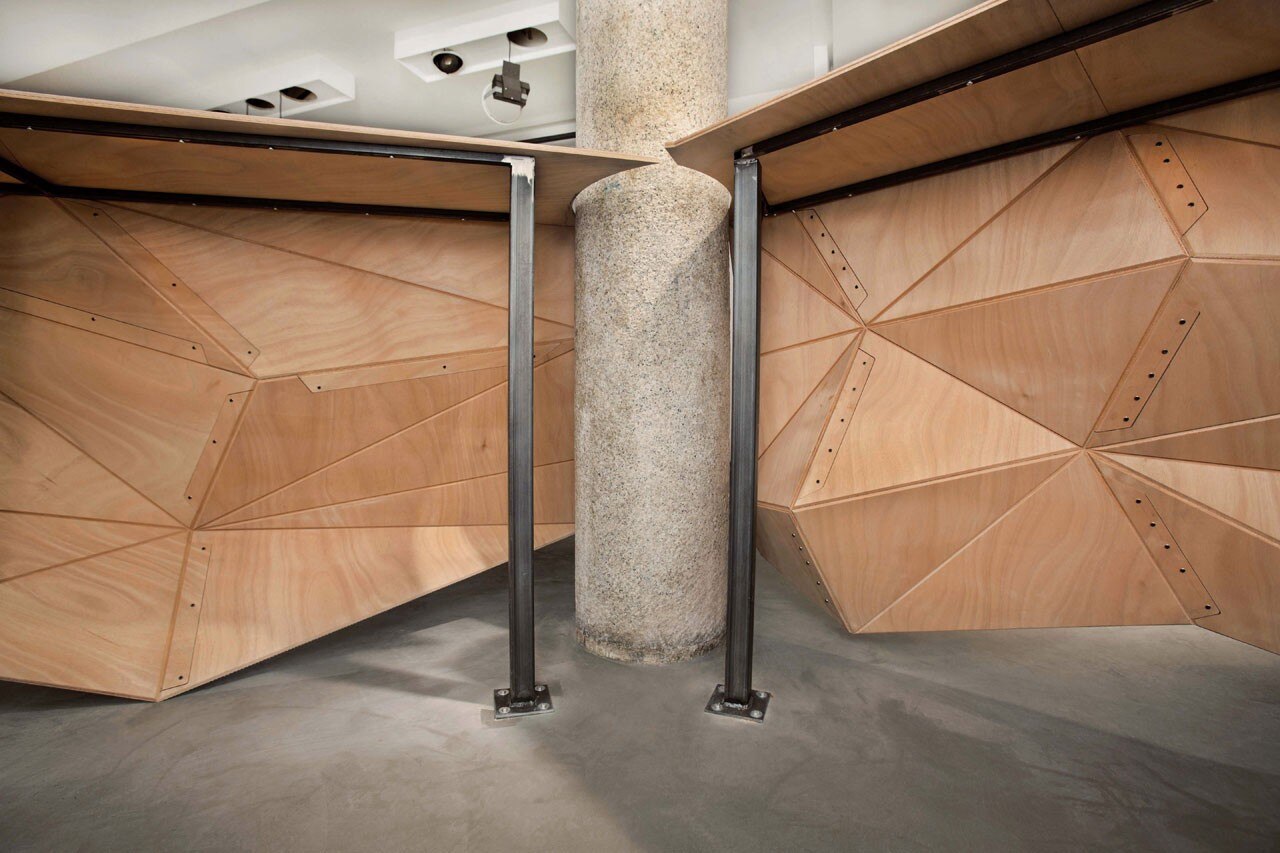Cardine del progetto è il lungo bancone in Wood-Skin™ che attraversa lo spazio. Wood-Skin™ è un materiale digitale, ovvero creato attraverso il trasferimento di informazioni (dati) dal computer al supporto vero e proprio (il legno) grazie a macchine a controllo numerico, che permettono le applicazioni dell’architettura parametrica.