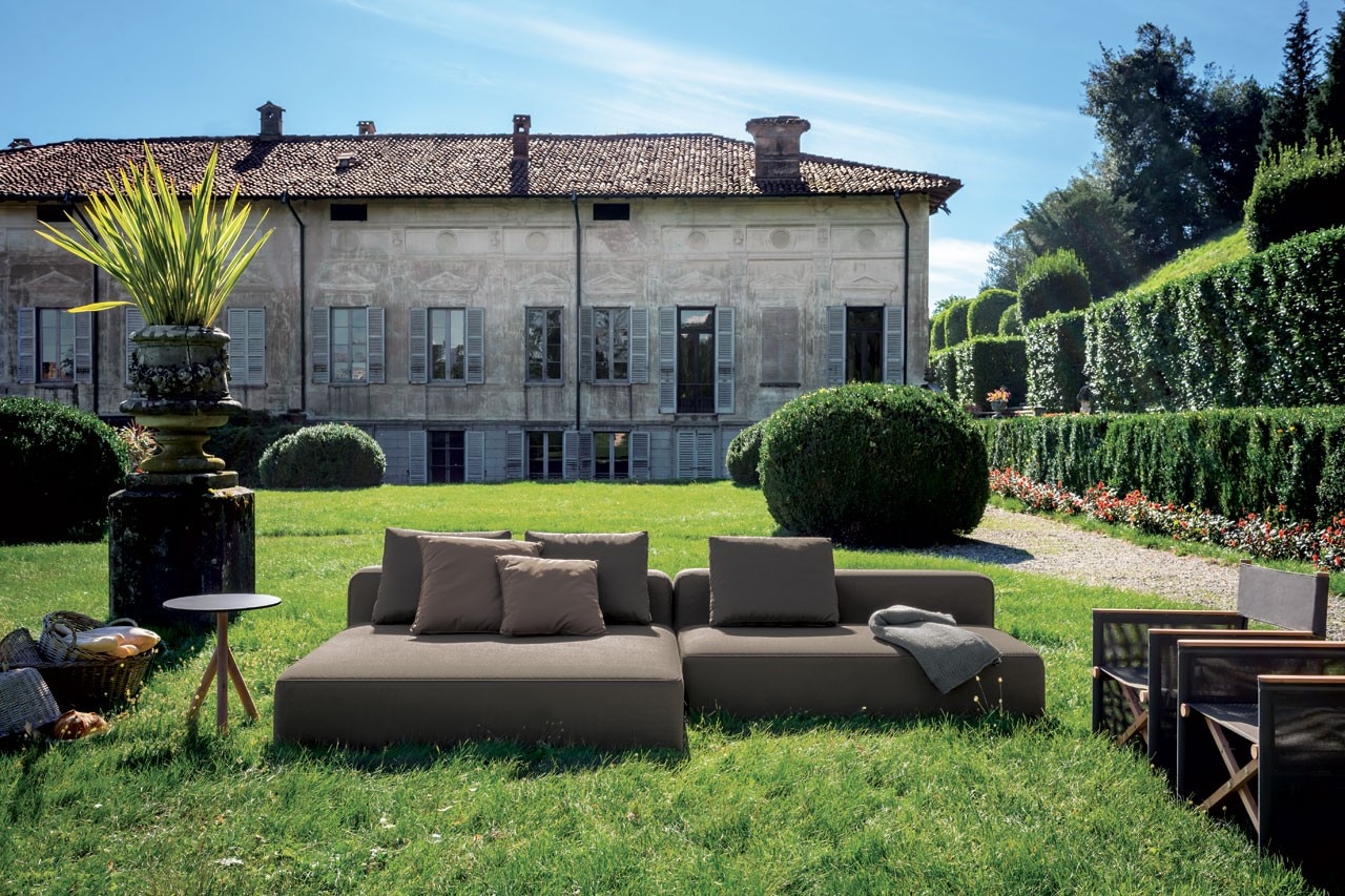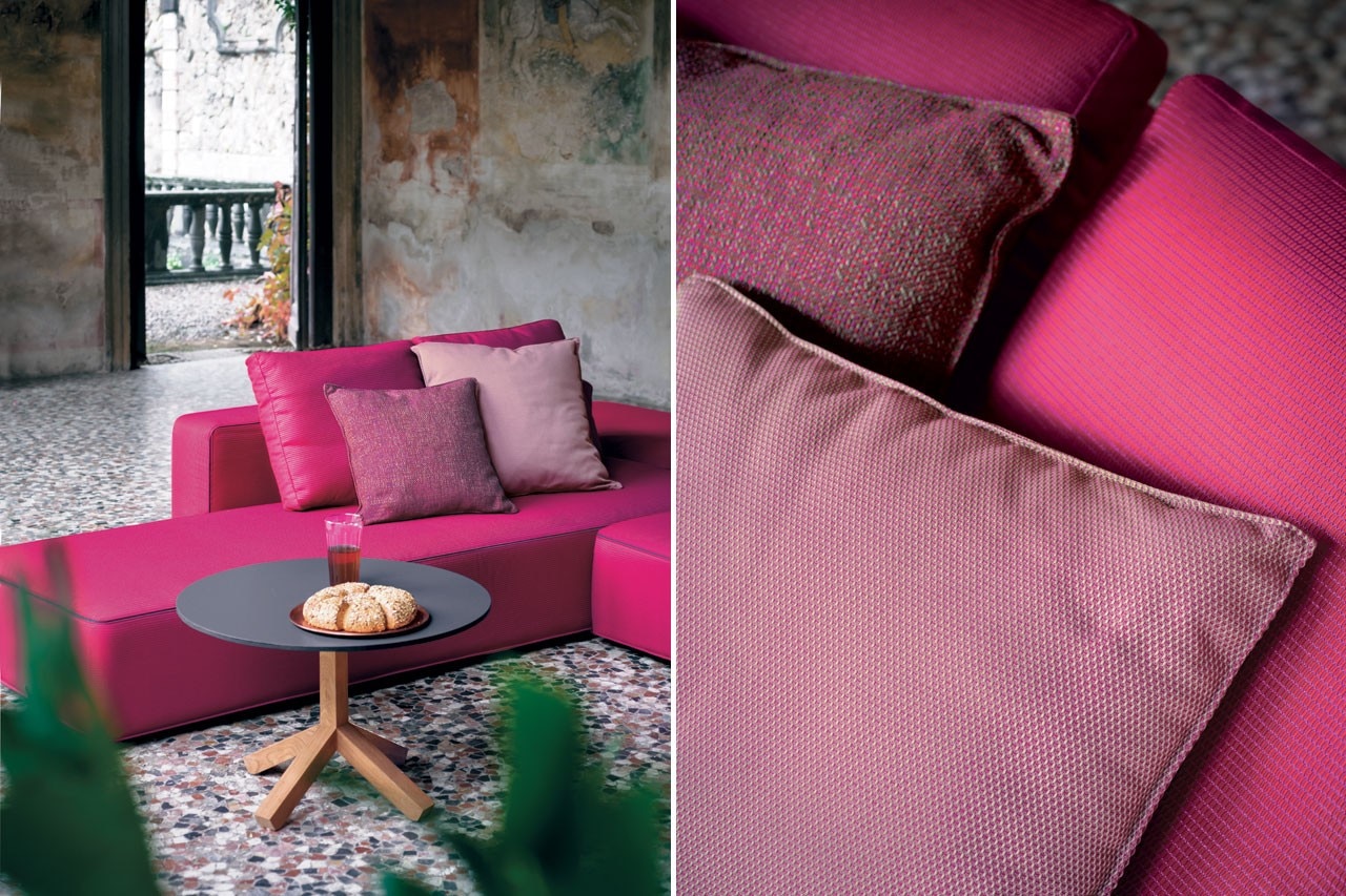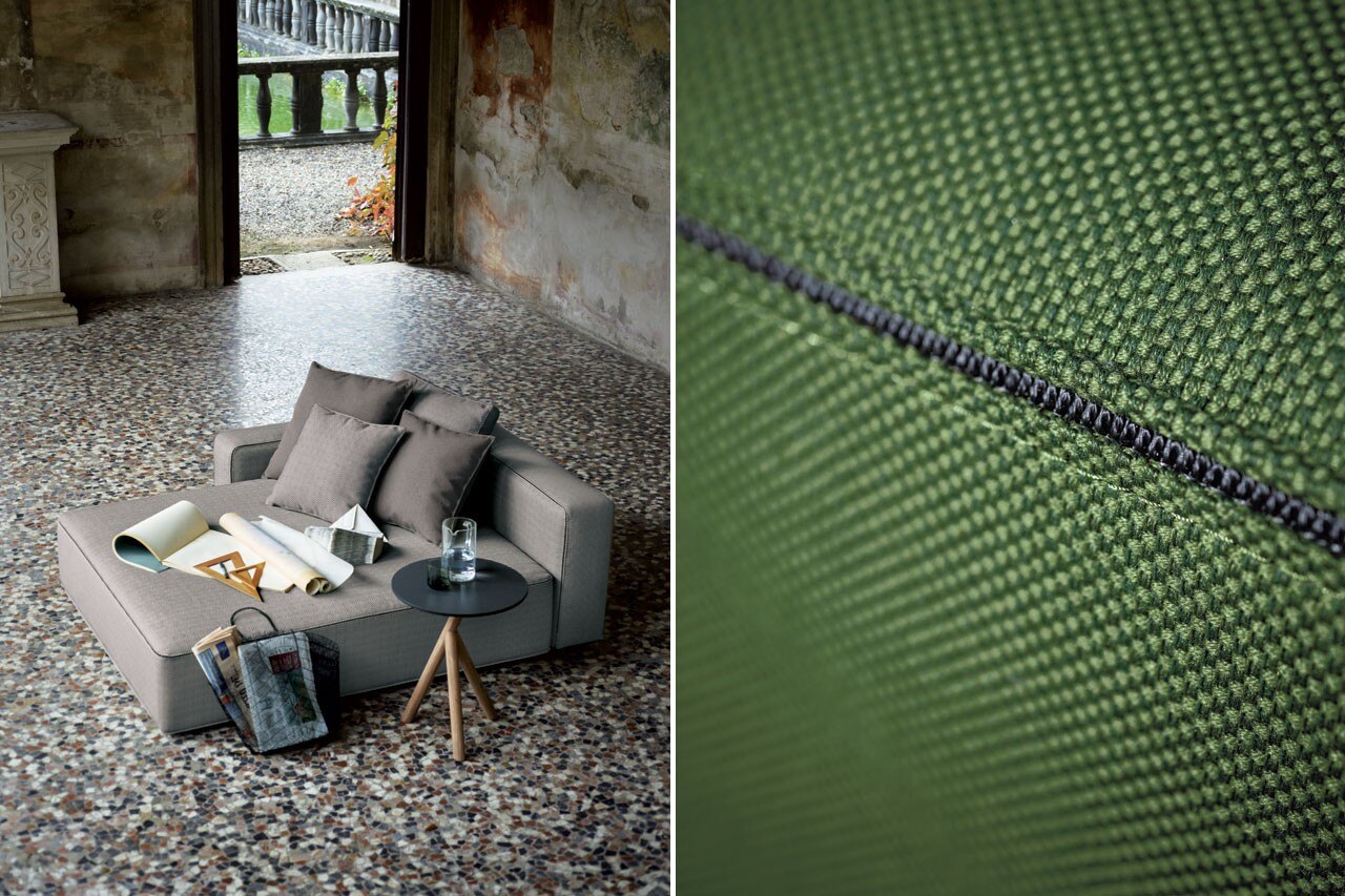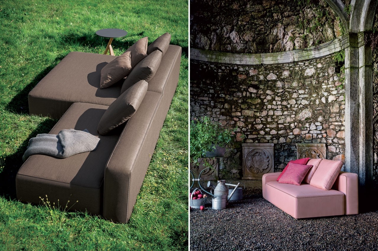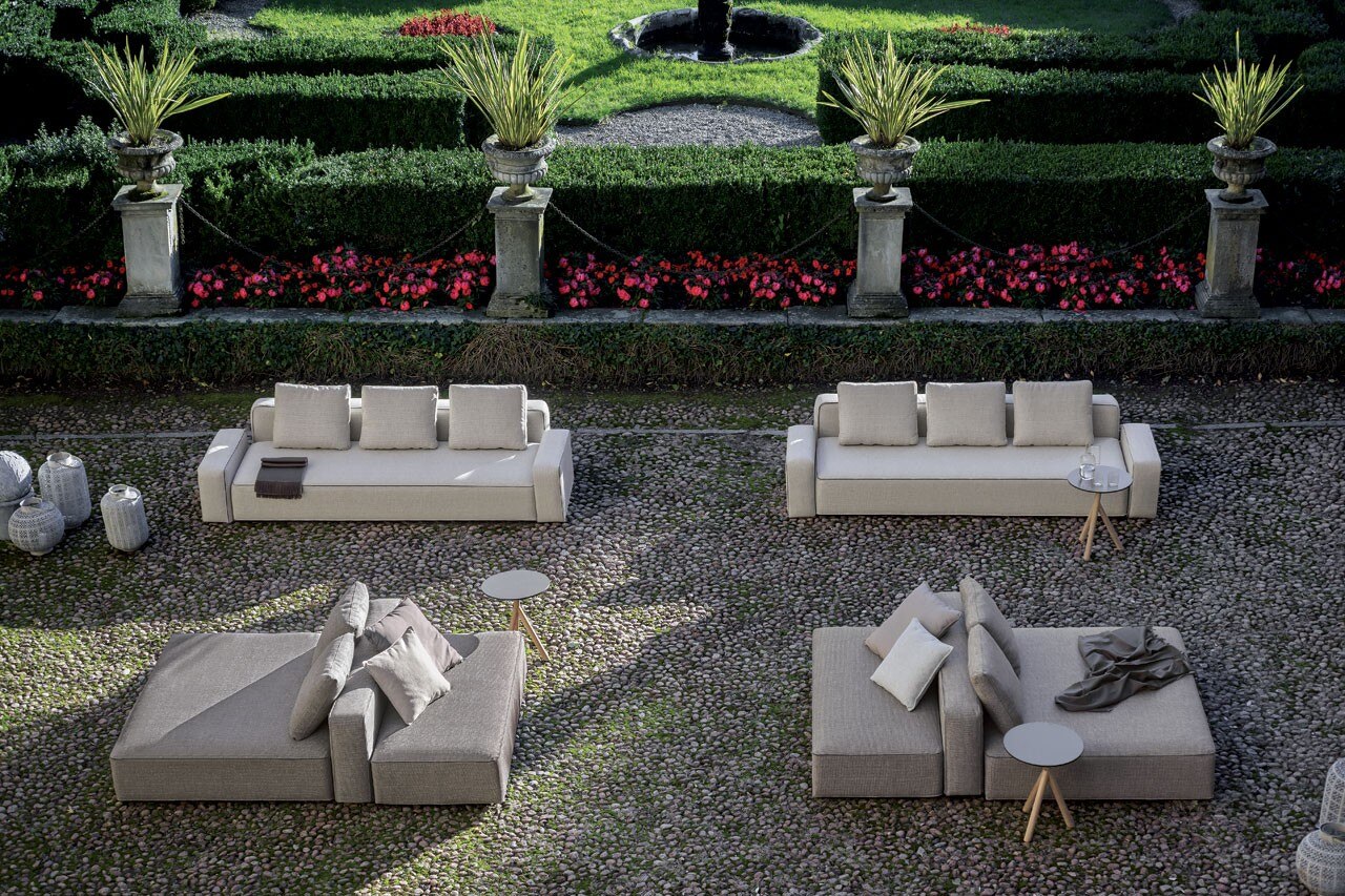Con la collezione Dandy, firmata da Rodolfo Dordoni, Roda trasferisce all’esterno il divano tessile da interno.