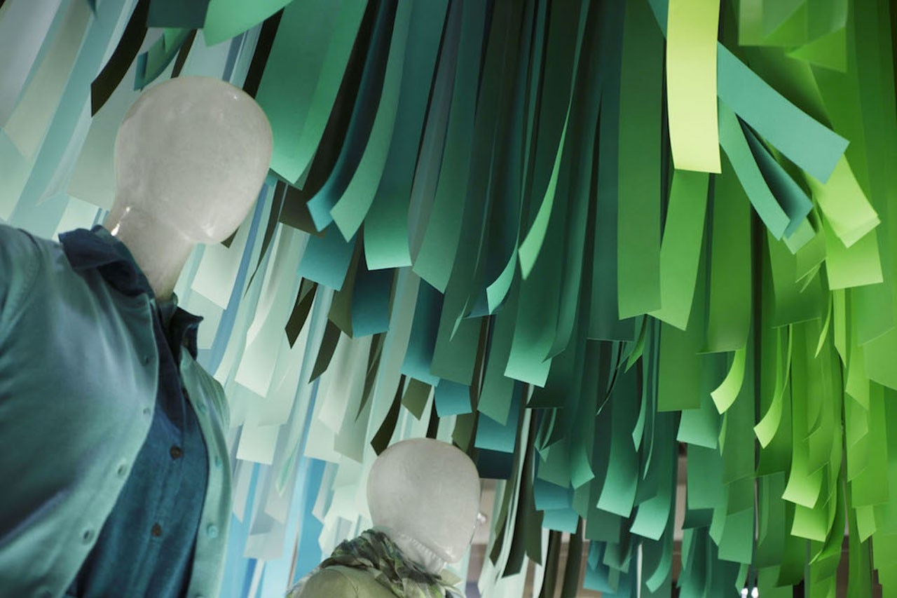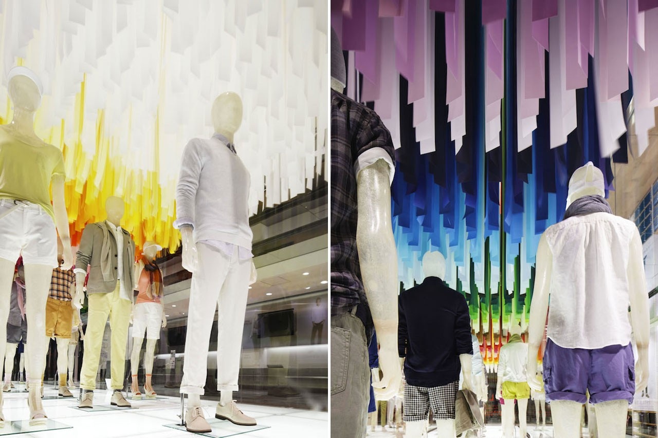 Il concept è l’immagine di un “vento colorato”: veli di carta in 100 tonalità diverse sono sospesi al soffitto, sopra la testa dei manichini, ondeggiando per dare la sensazione di un fresco vento primaverile.