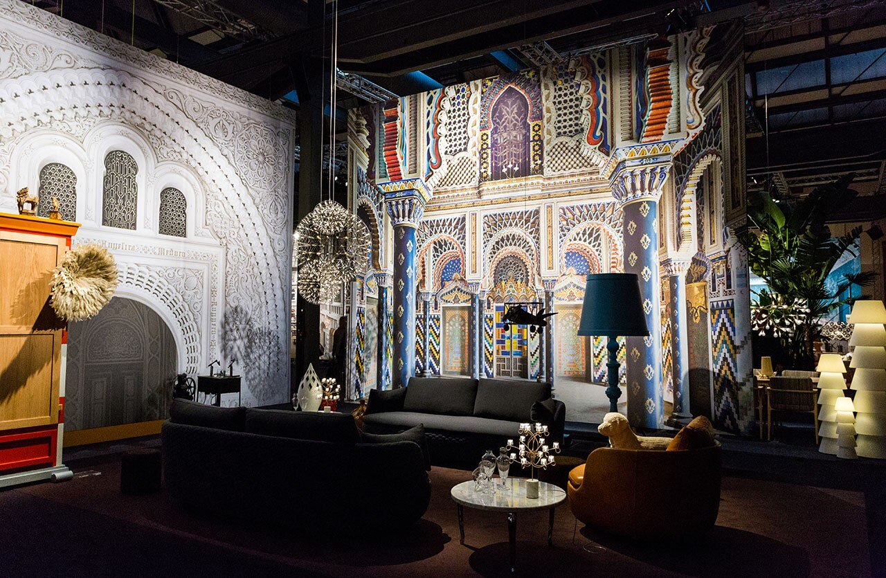 L’ampia collezione, che si compone di luci, arredi, tessuti e oggetti, s’ispira a viaggi in luoghi lontani e restituisce la preziosità dei tessuti e la ricchezza dei colori di oggetti senza tempo. Firmati Studio Job, Bertjan Pot, Kiki van Eijk, Scholten & Baijings Bart Schilder, Joost van Bleiswijk e dallo stesso Wanders, gli oggetti si stagliano sulle fotografie, di quasi 5 metri di altezza, che dividono lo spazio e fanno da scenografia agli arredi.