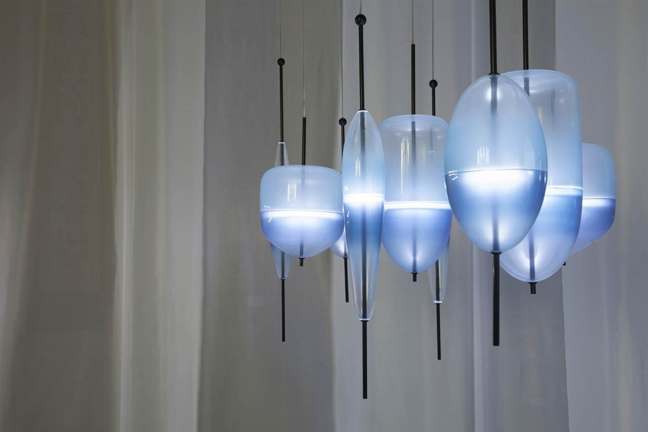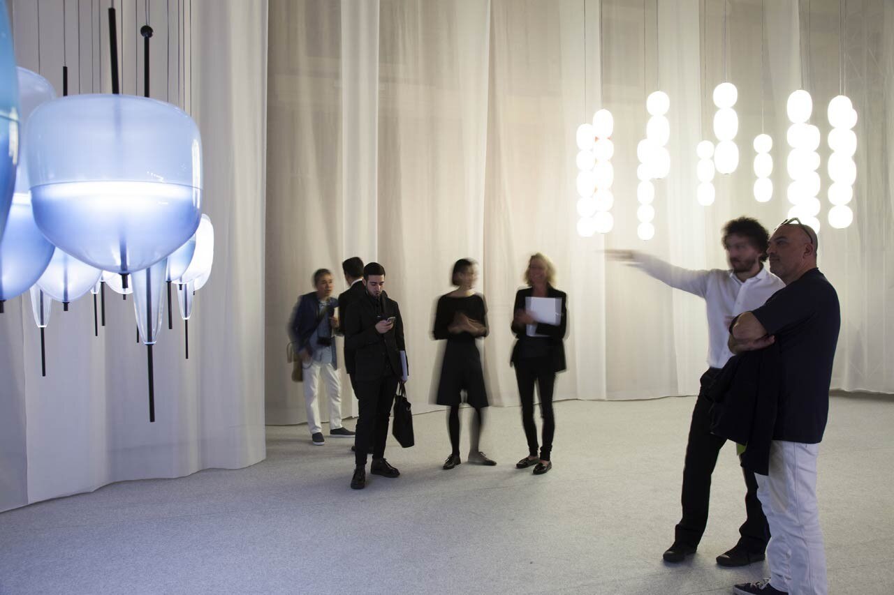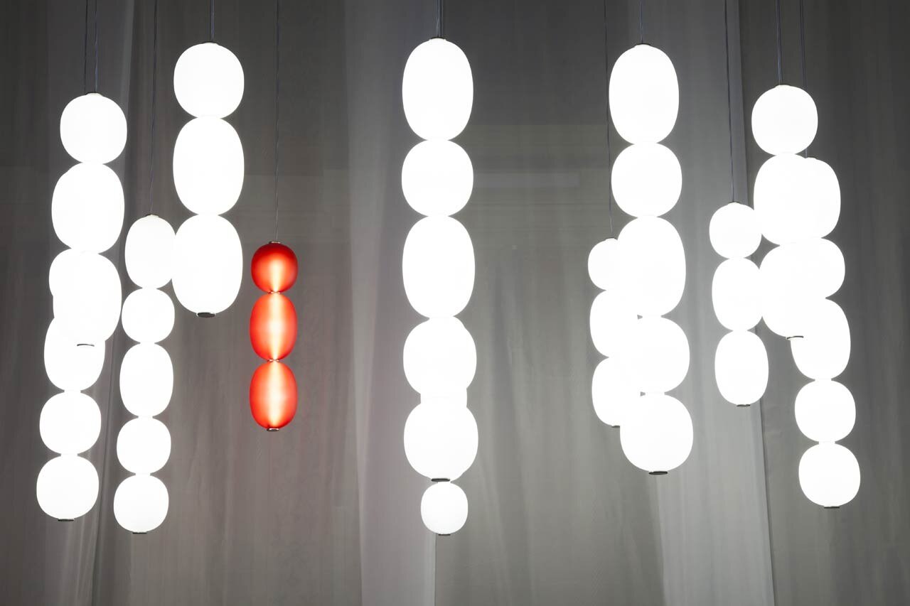 Grappa di Claesson Koivisto Rune è un grappolo di acini d’uva che punta alla varietà attraverso la ripetizione, accostando forme simili ma di diverse dimensioni. Il vetro traslucido permette alla sorgente LED di filtrare attraverso. Luma di Hadid è invece una composizione scultorea di quattro segmenti tubolari che seguono la medesima traiettoria. Infine, Sleeve di John Pawson è una serie di cilindri di vetro soffiato a mano l’uno dentro l’altro.