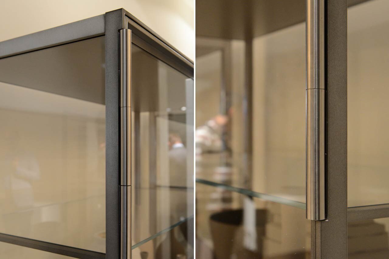 Elementi funzionali, i cardini delle ante sono allo stesso tempo un dettaglio estetico: il bagno galvanico con cui sono trattati fa in modo che la brunitura dell'alluminio restituisca un colore profondo e pieno.