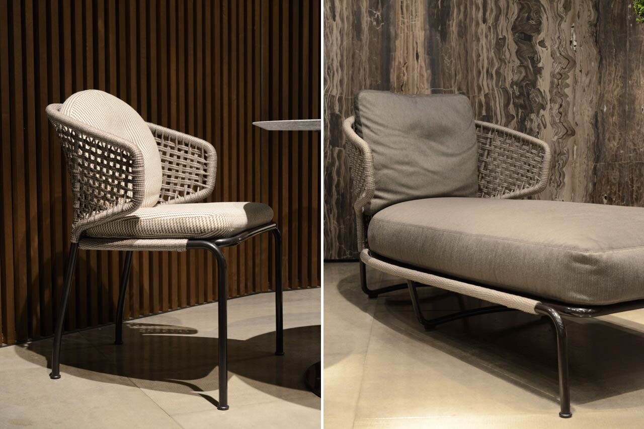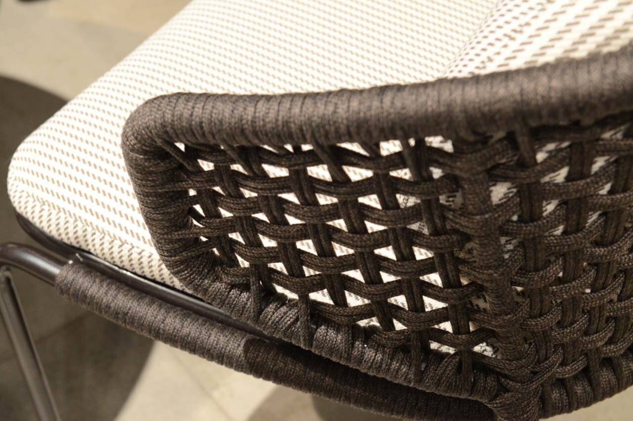 Nella versione per esterni, la serie Aston Cord si compone di una struttura in metallo verniciato poliestere color peltro trattato per esterni e d’imbottiture rivestite di tessuto impermeabile. Lo schienale è in uno speciale filato di polipropilene intrecciato del diametro di 7 mm, proposto in due varianti cromatiche: grigio chiaro e marrone scuro.