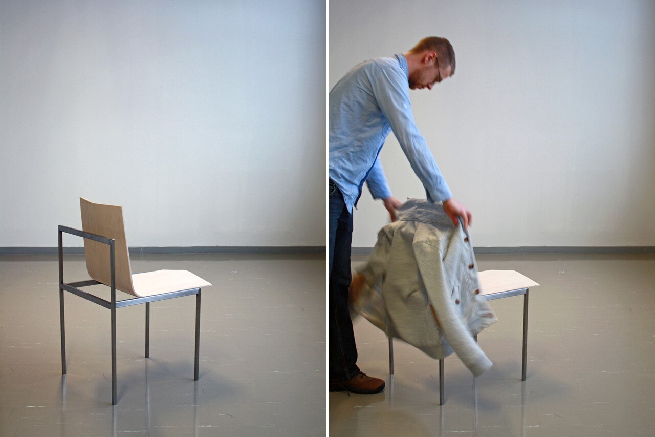 Il disegno di Hang Out contiene piccole migliorie rispetto a una seduta tradizionale, come l’appoggio per appendere gli abiti e la curvatura del sedile, che permette una postura più ergonomica. La barra-appendiabiti funziona anche come maniglia che facilita la presa della sedia.